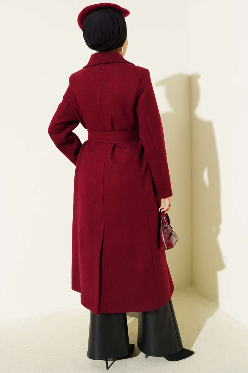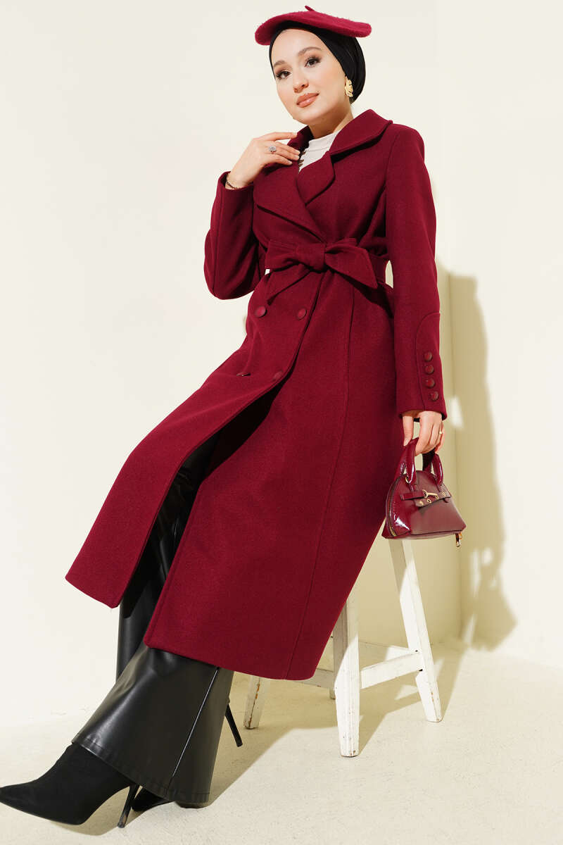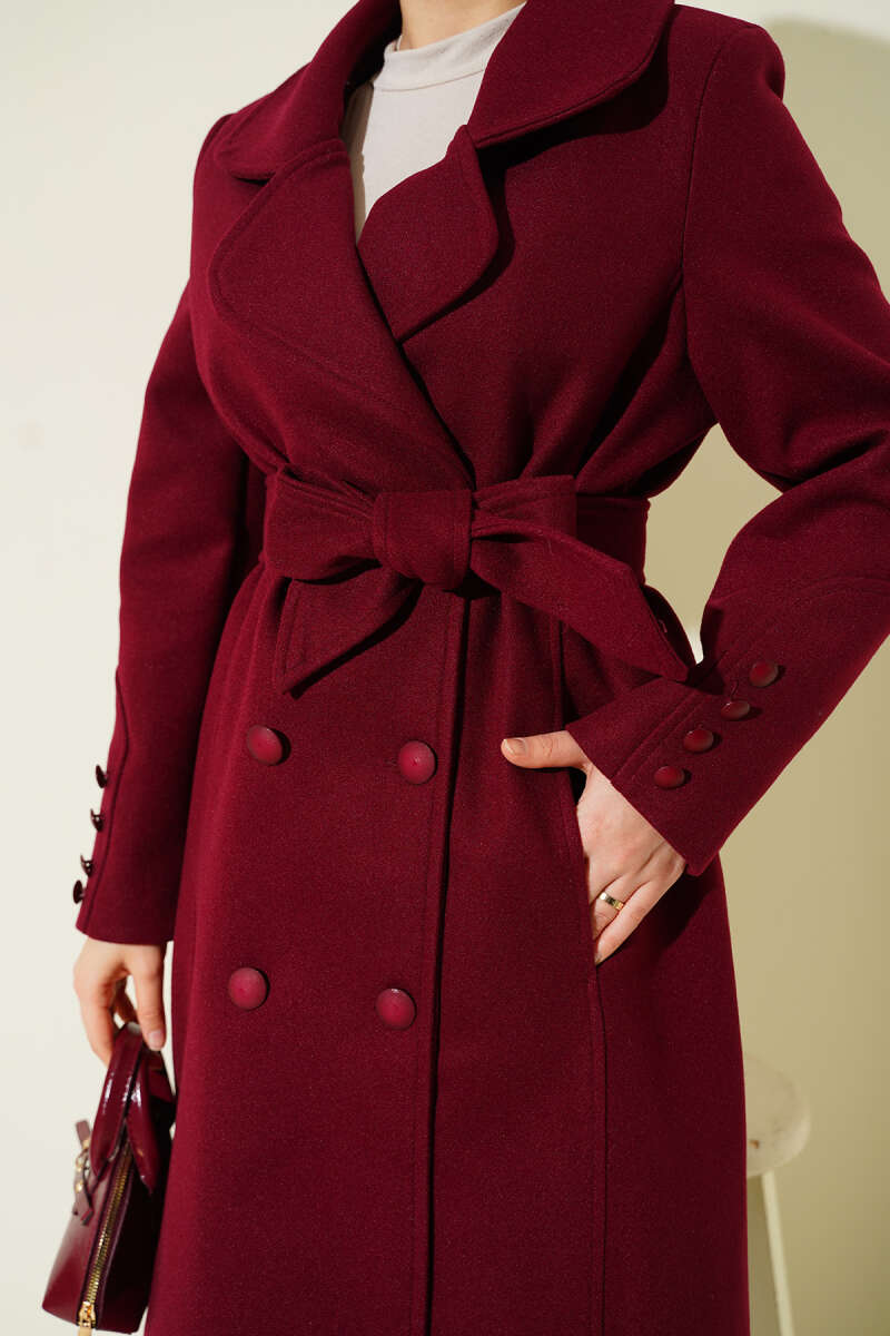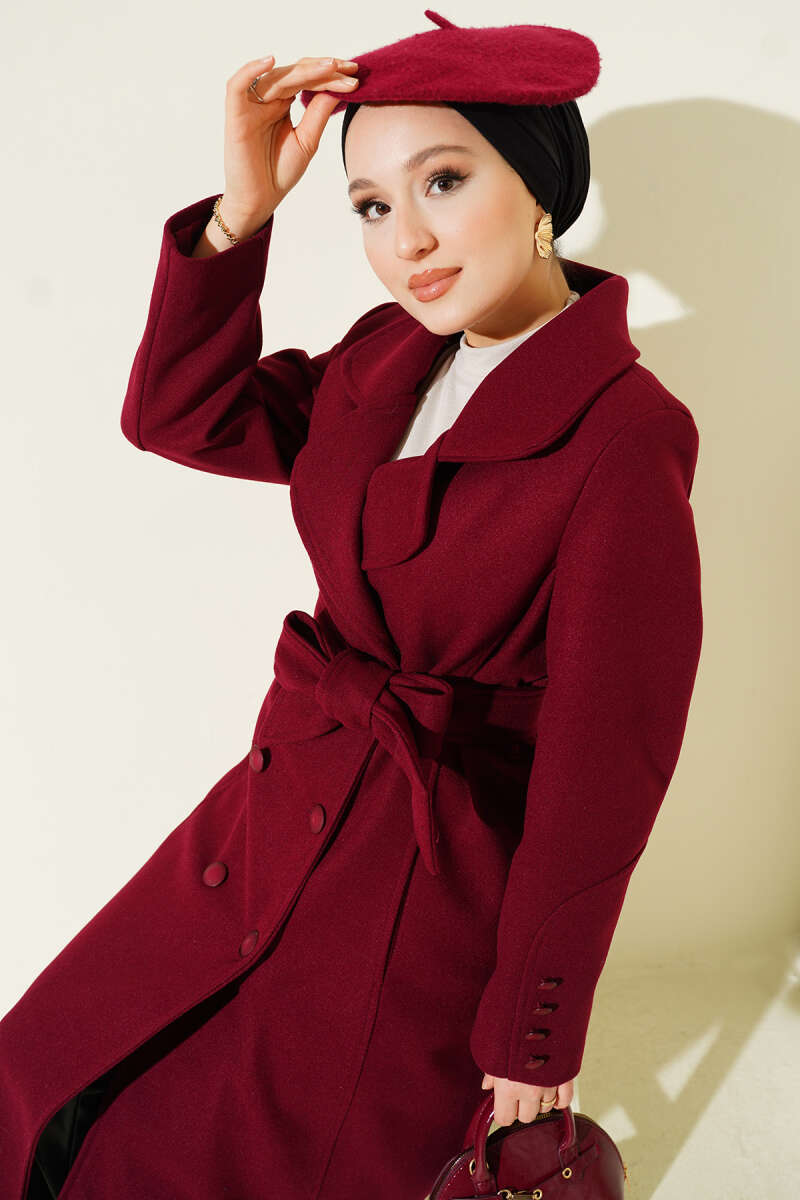 Kruvaze Yaka Omuz Apoletli Kaşe Kaban Bordo