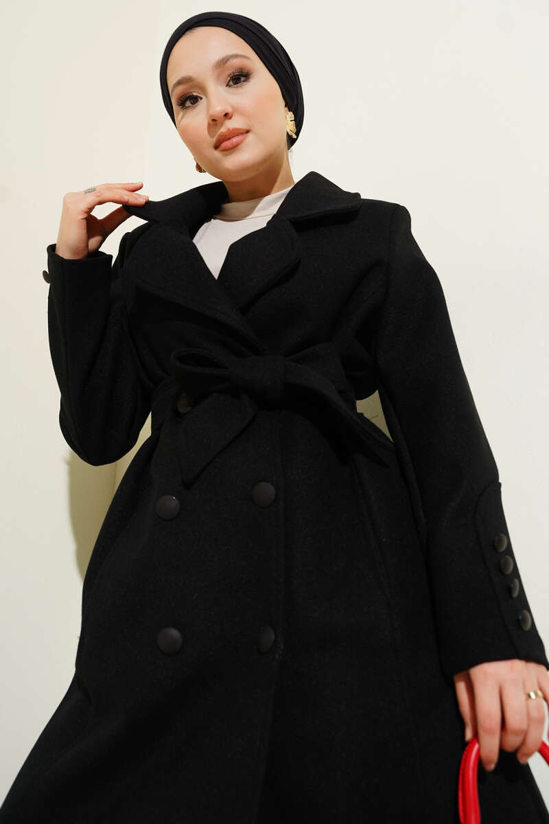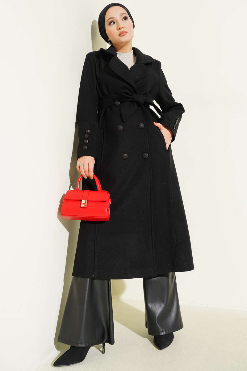 Kol Düğme Detaylı Kruvaze Kaban Siyah