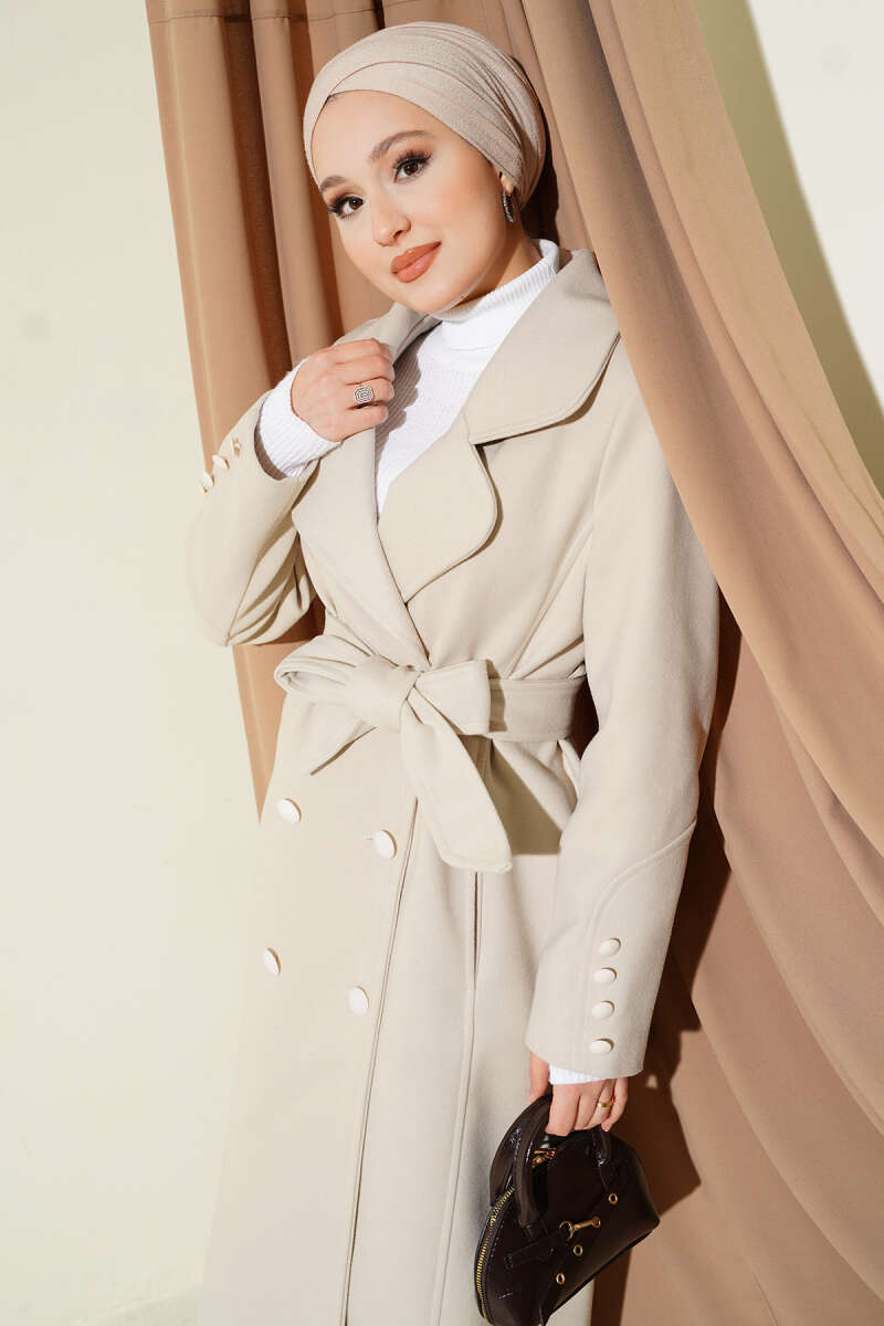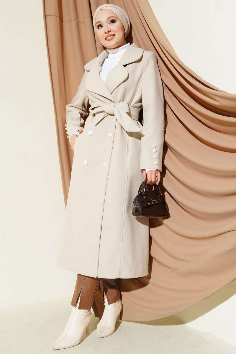 Bilek Düğmeli Kuşaklı Kaşe Kaban Gri