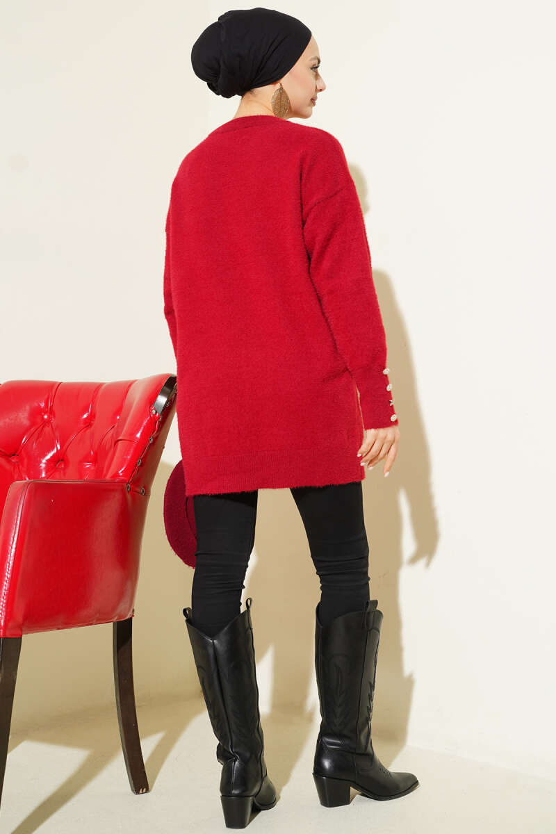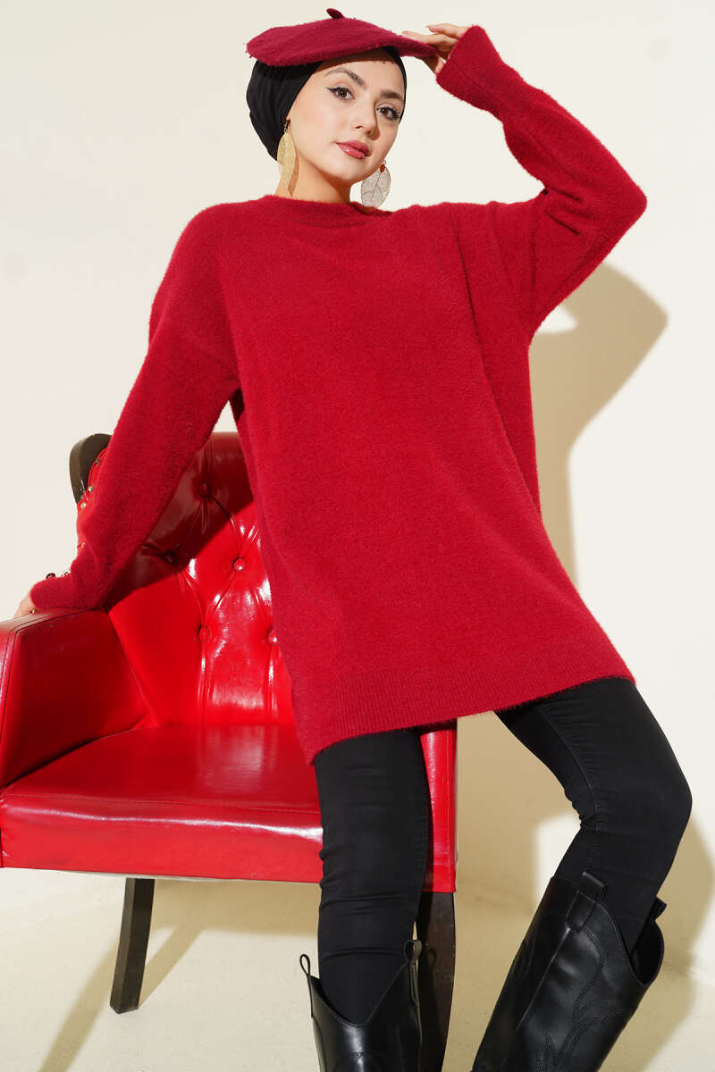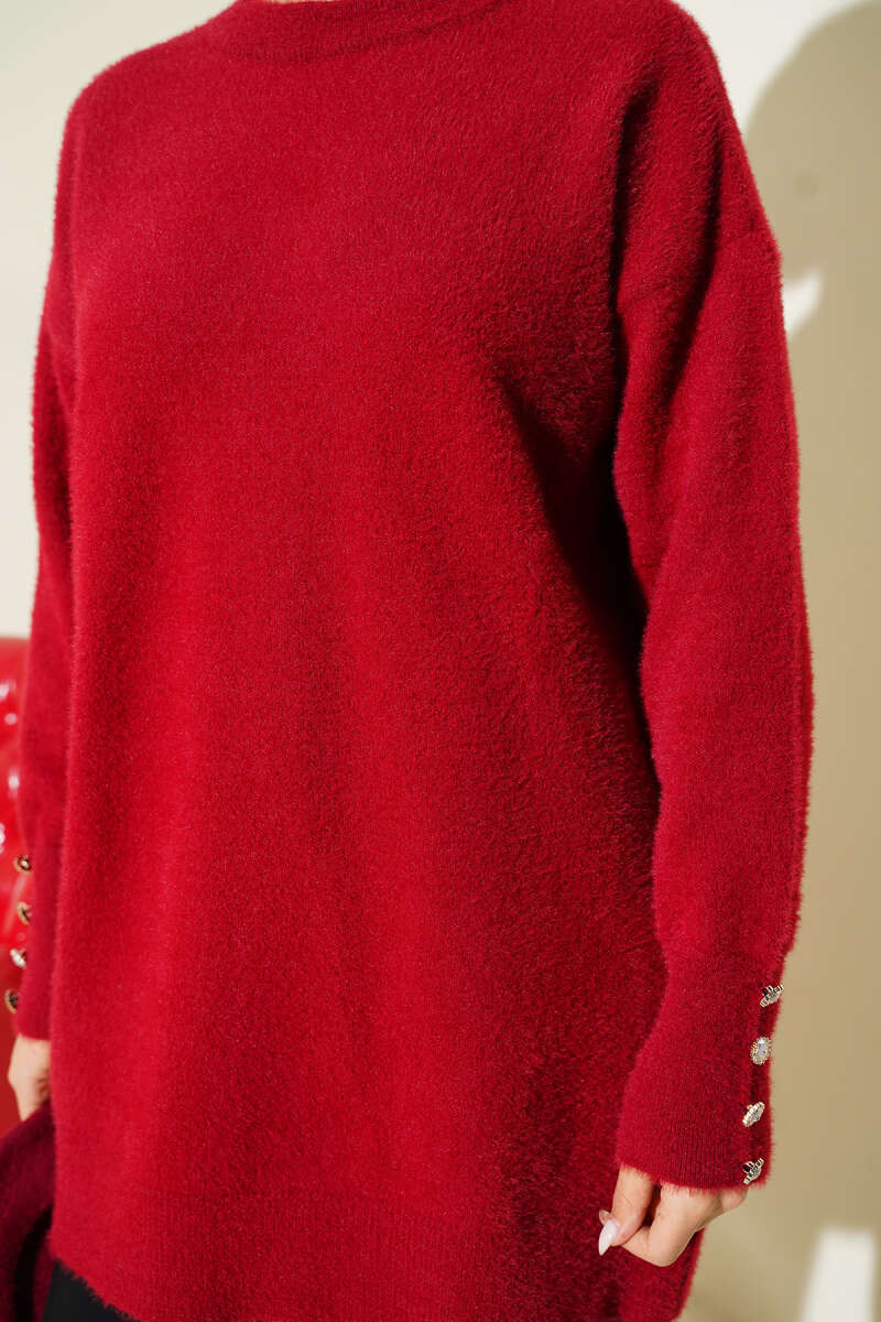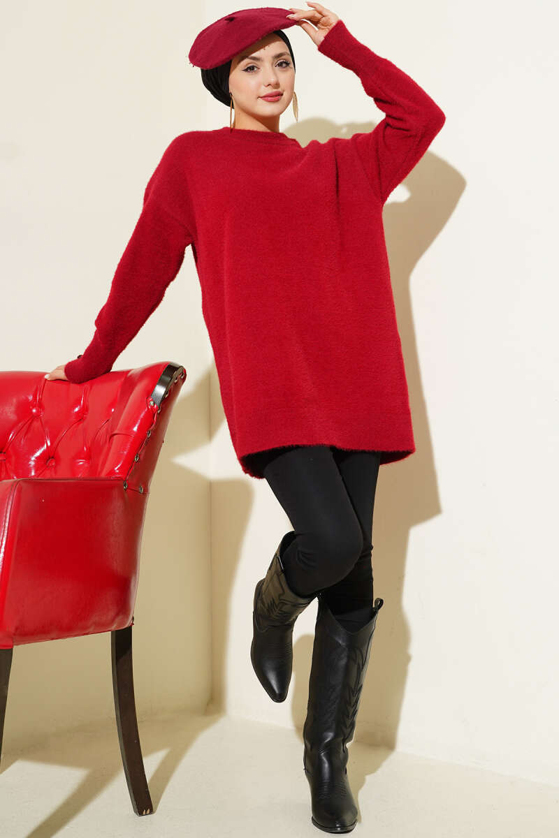 Yatay Çizgili Balon Kol Triko Tunik Bordo