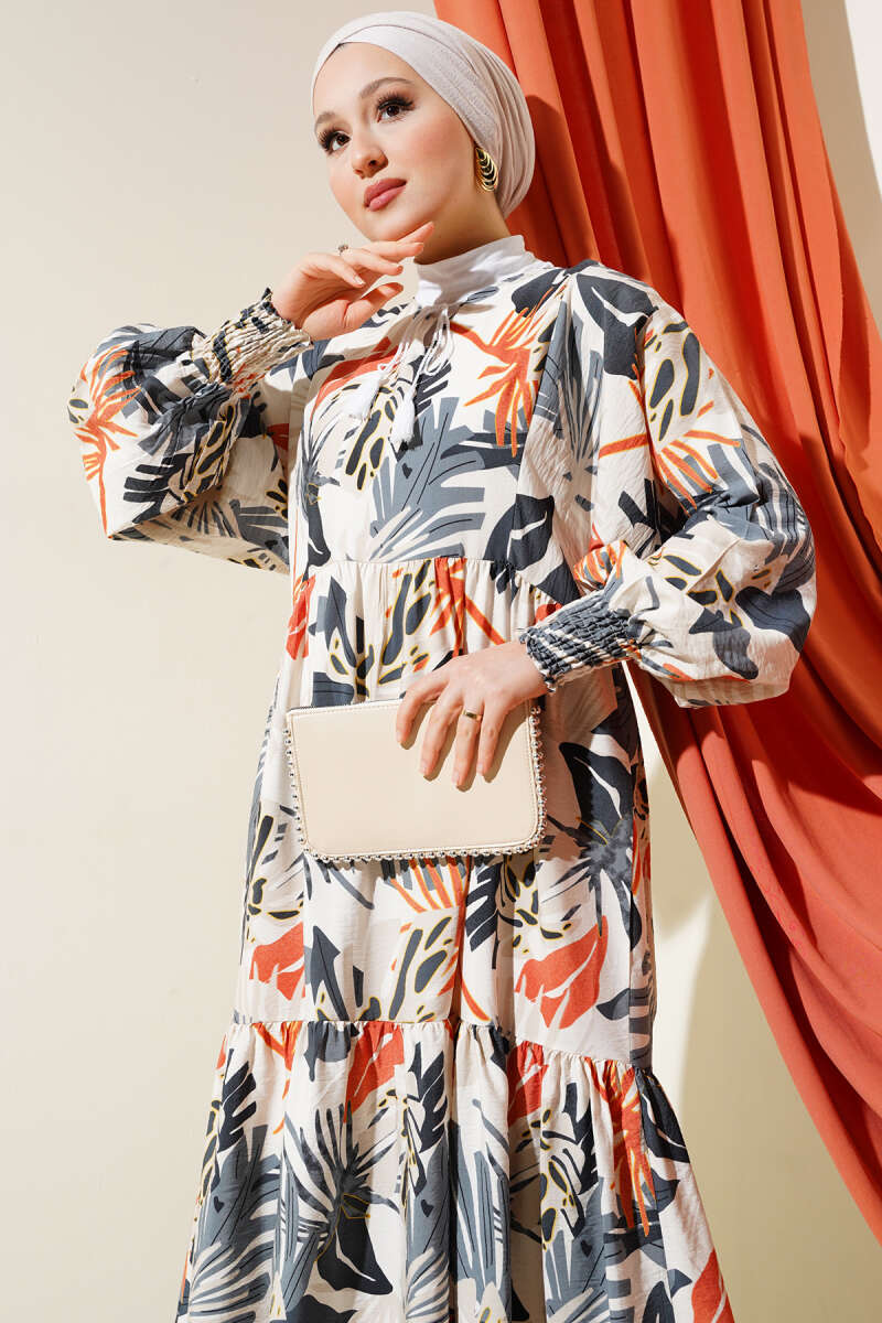 Çizgi Gömlek Garnili Triko Elbise Bej