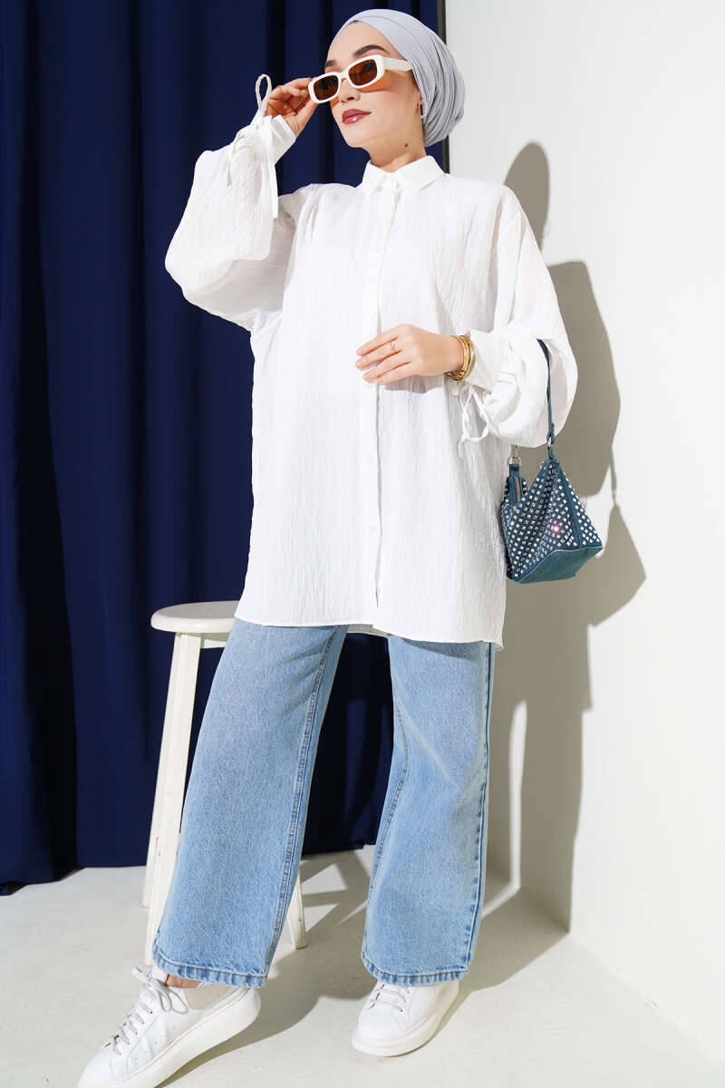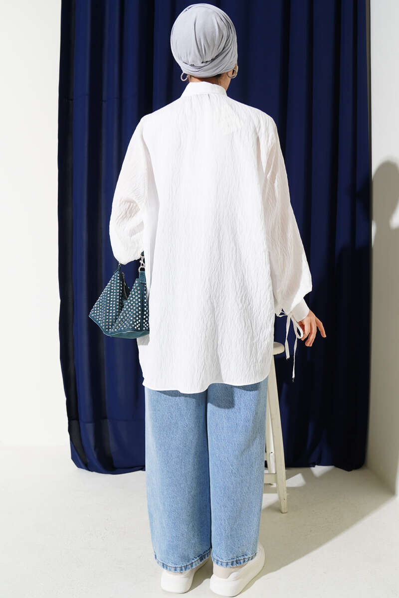 Bilek İp Bağcıklı Oversize Gömlek Beyaz