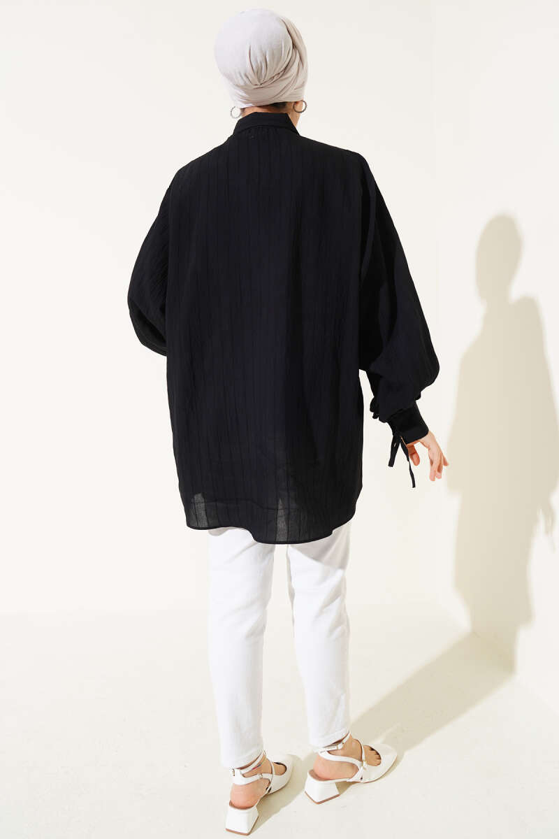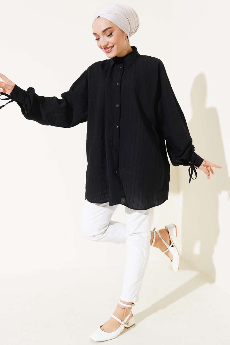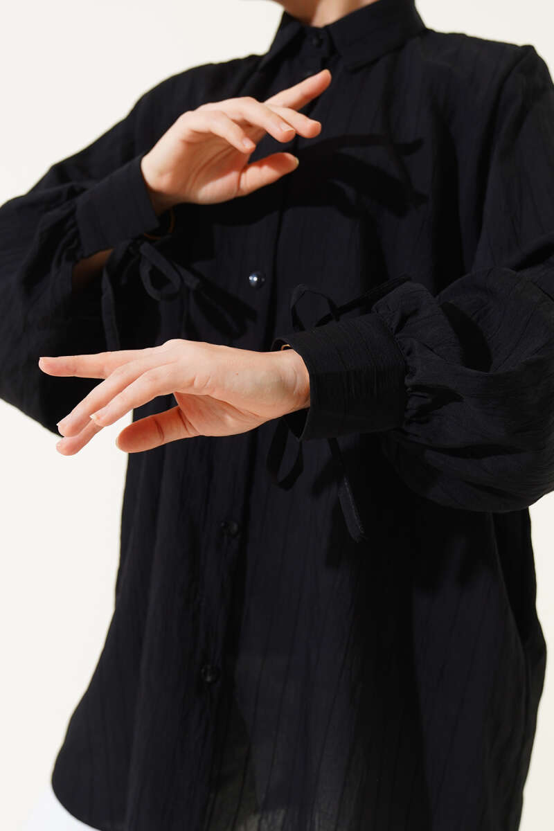 Bilek İp Bağcıklı Oversize Gömlek Siyah