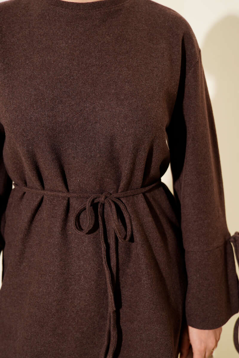 Yatay Çizgili Düşük Omuz Triko Tunik Kahve