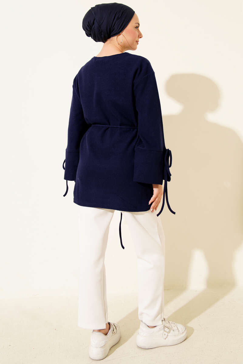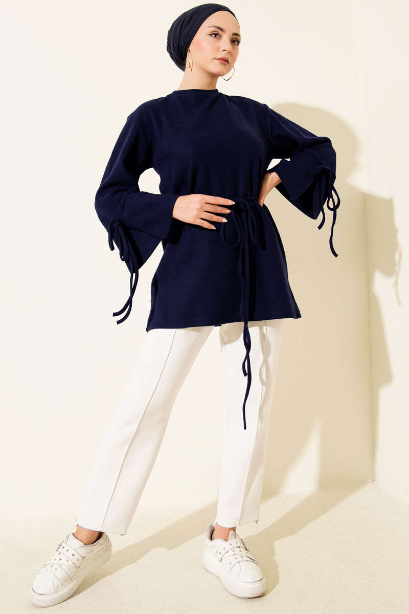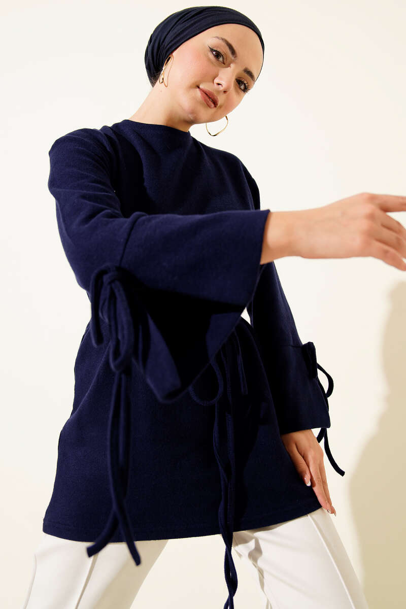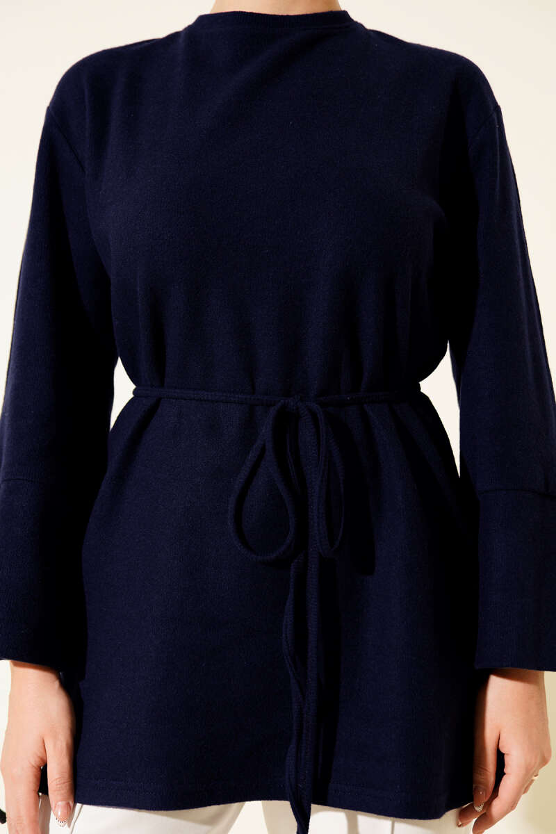 Bilek Düğmeli Fitilli Triko Tunik Lacivert