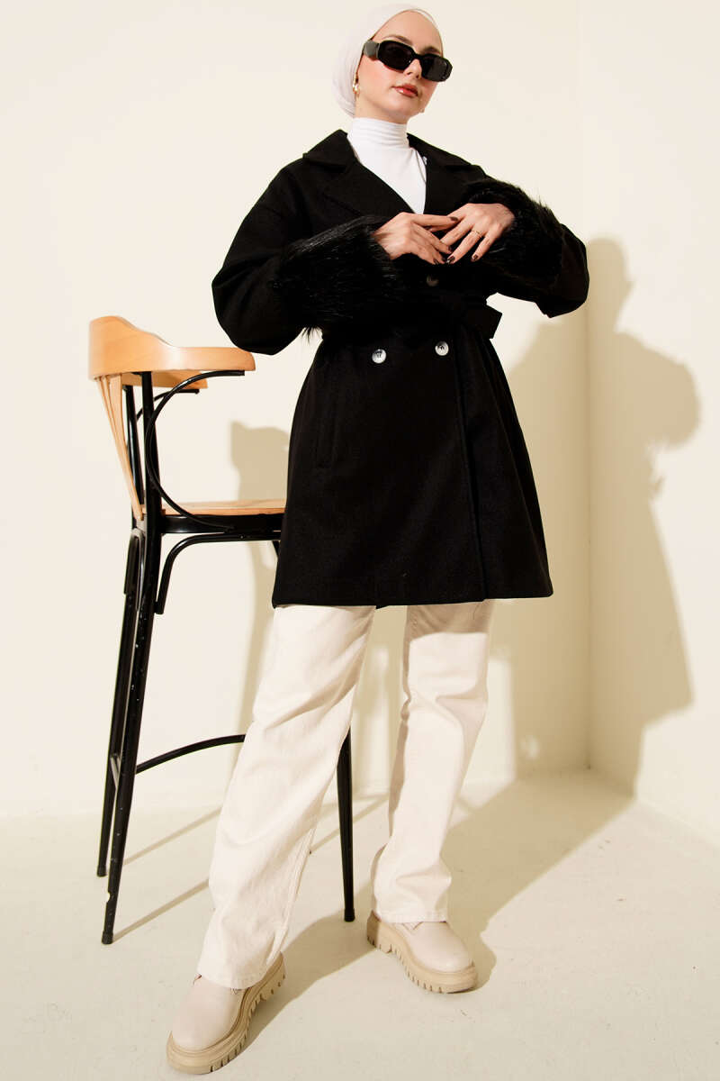 Bilek Kürklü Düğmeli Kaşe Kaban Acı Kahve