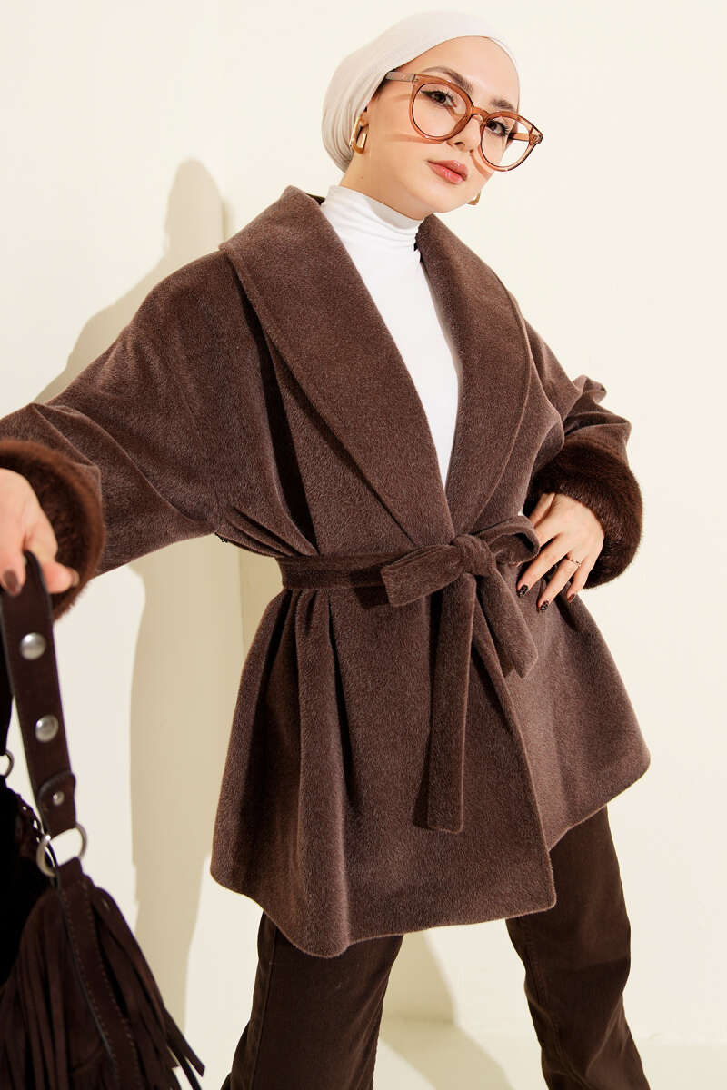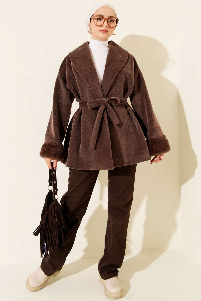 Kürk Yakalı Düğmeli Kaşe Kaban Kahve
