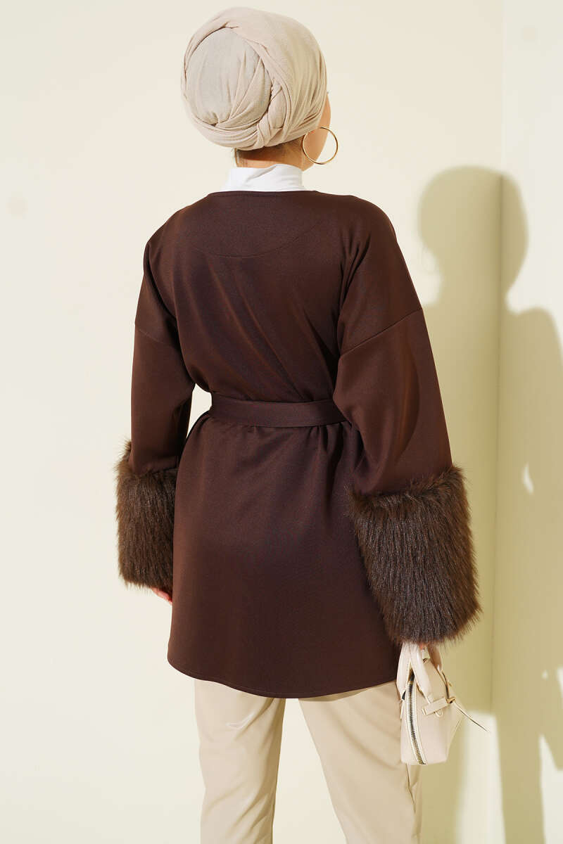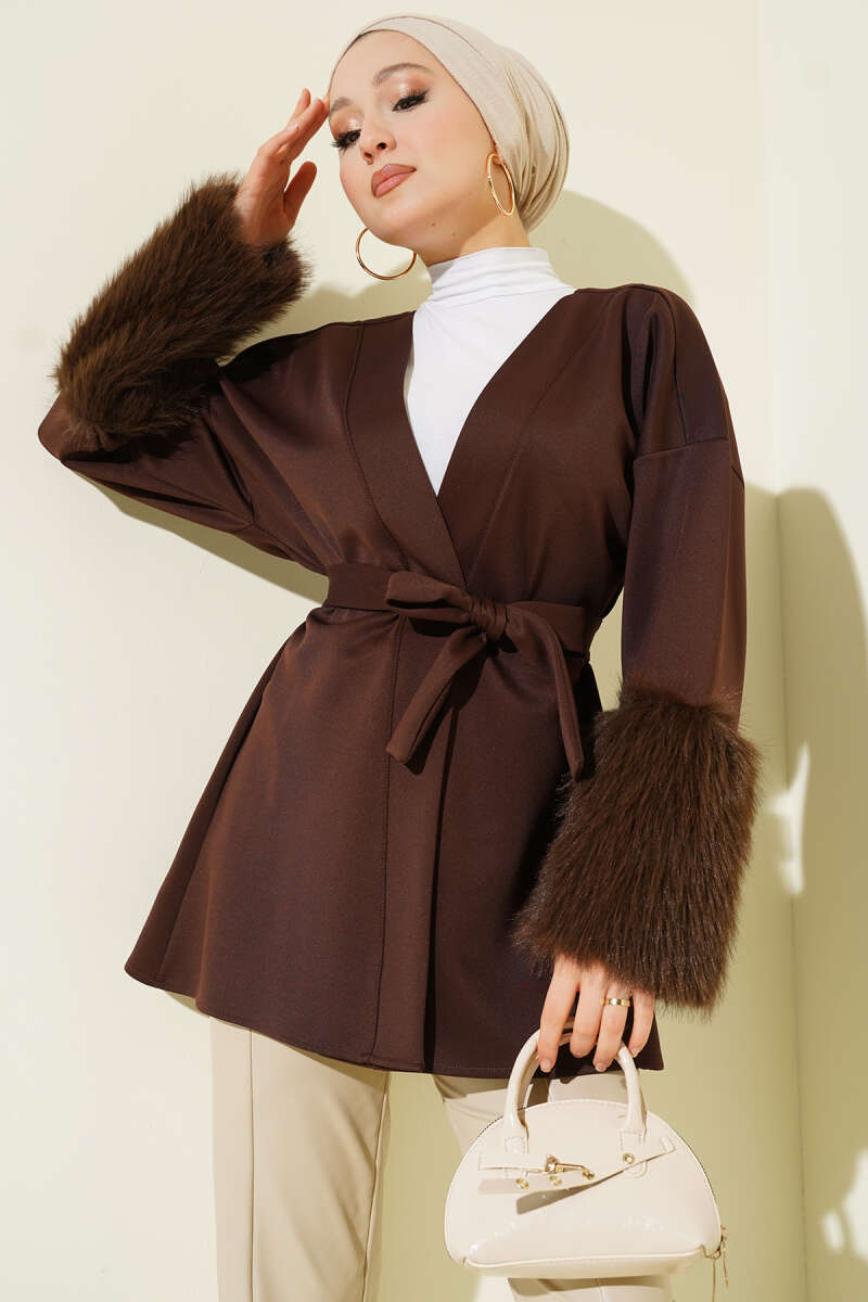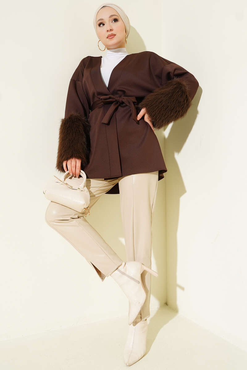 Düğmeli Kuşaklı Tay Tüyü Ceket Vizon