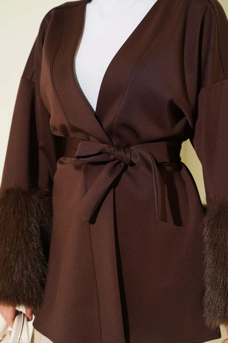 Bilek Kürklü Kuşaklı Scuba Ceket Siyah