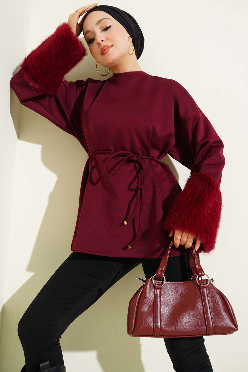Asimetrik Kabartma Çizgili Triko Tunik Bordo