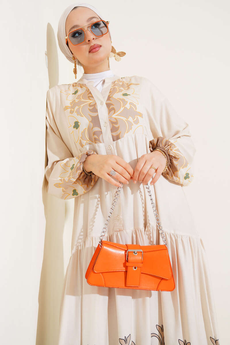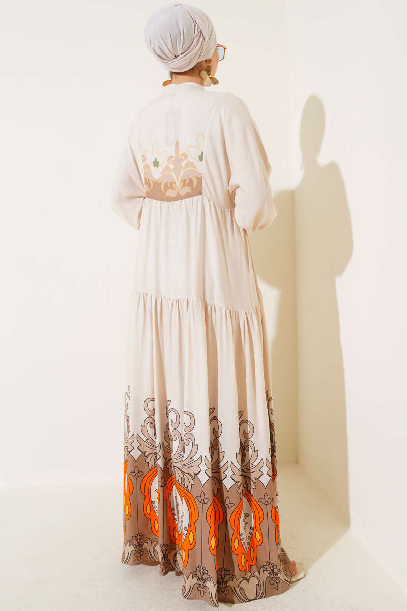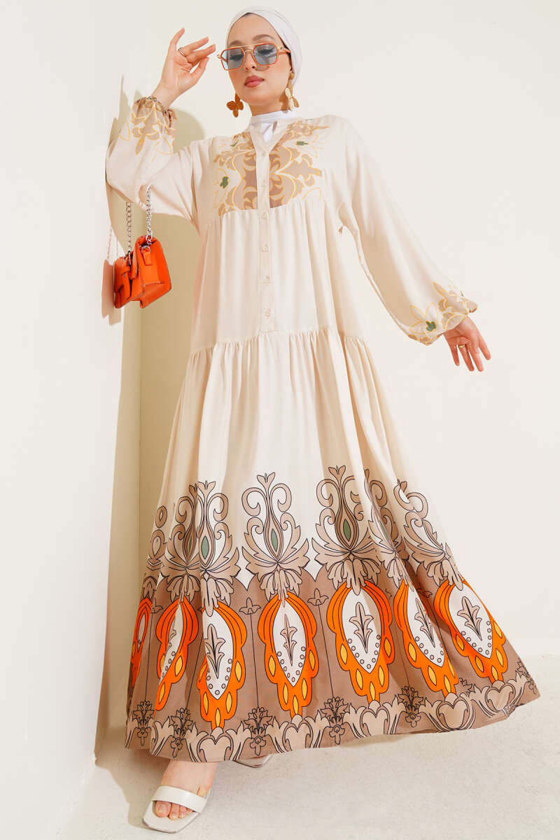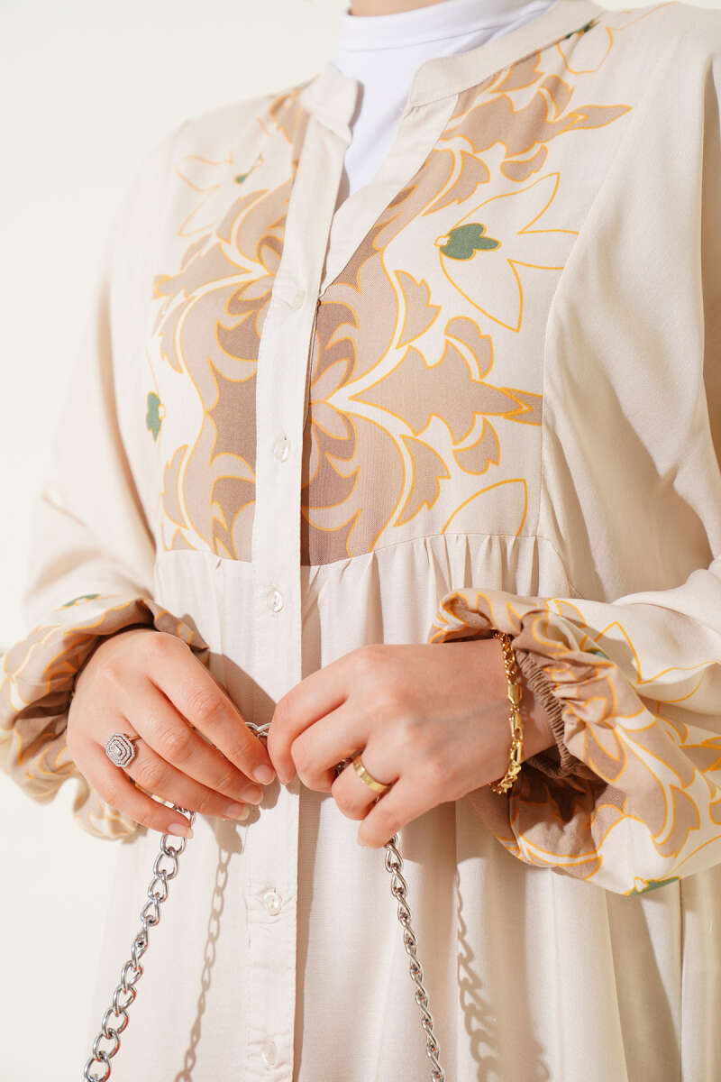 Desenli İp Kuşaklı Düğmeli Viskon Elbise Ekru