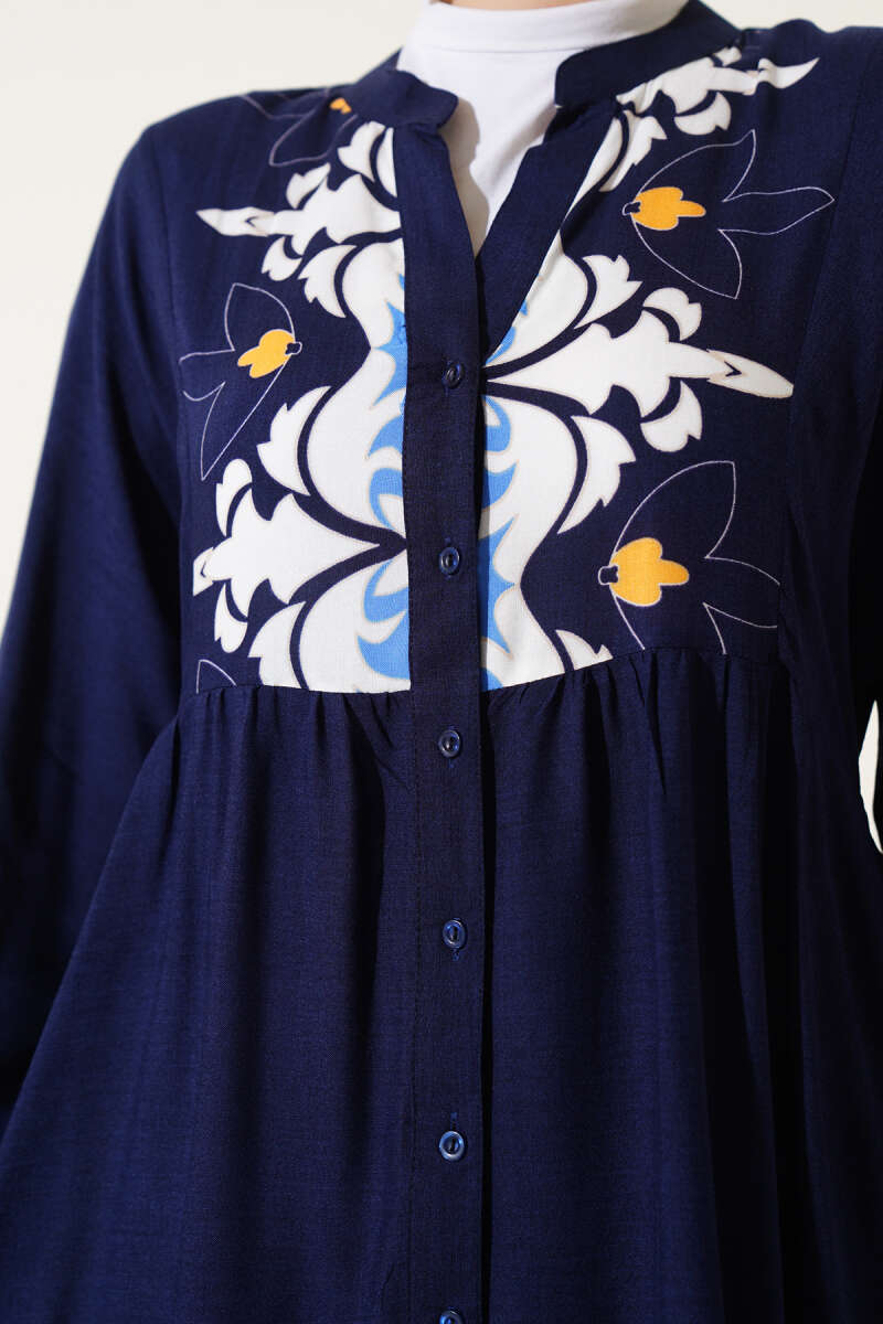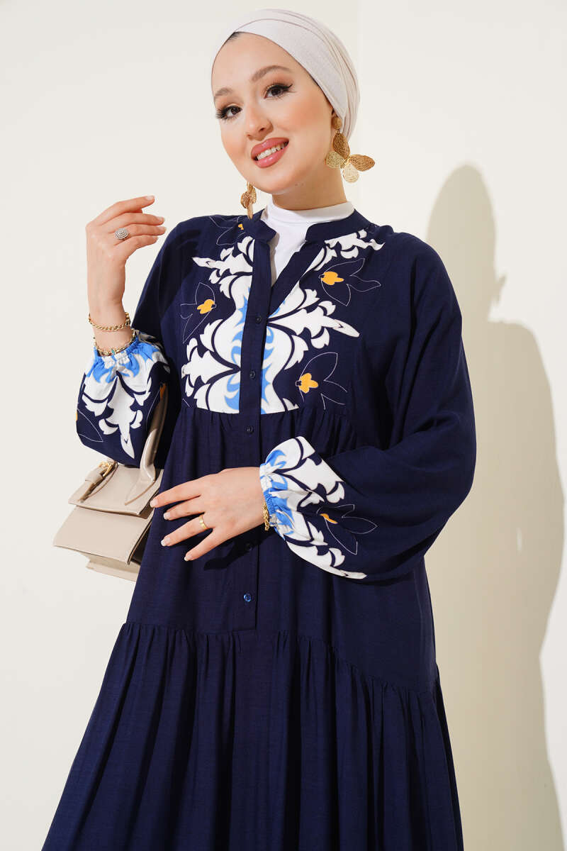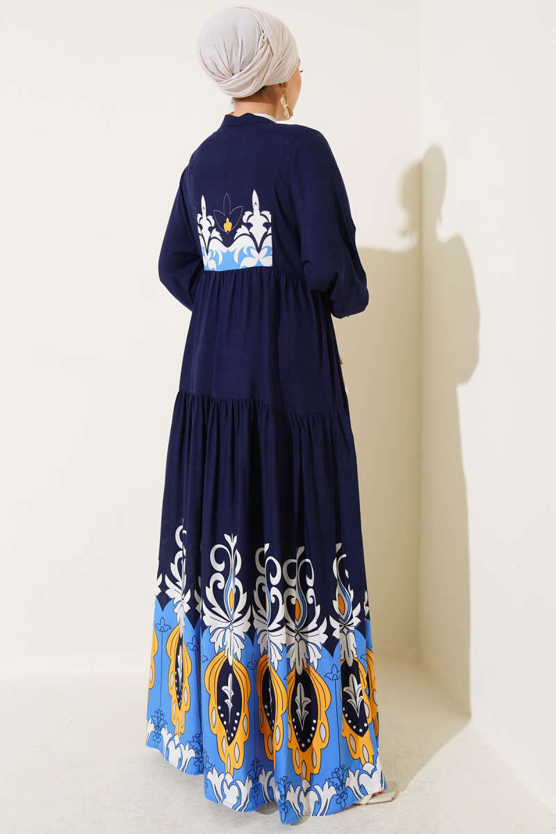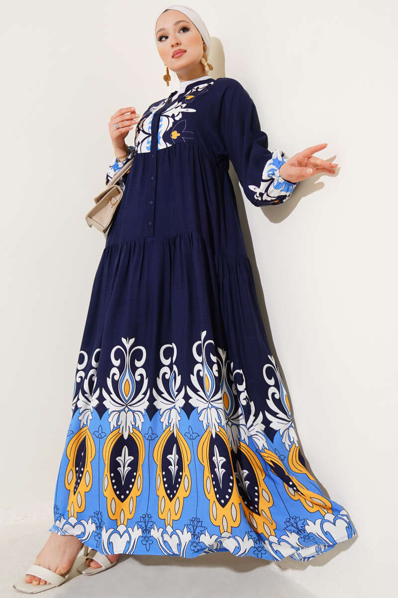 Bilek Lastikli Desenli Viskon Elbise Lacivert
