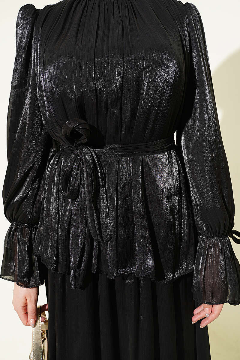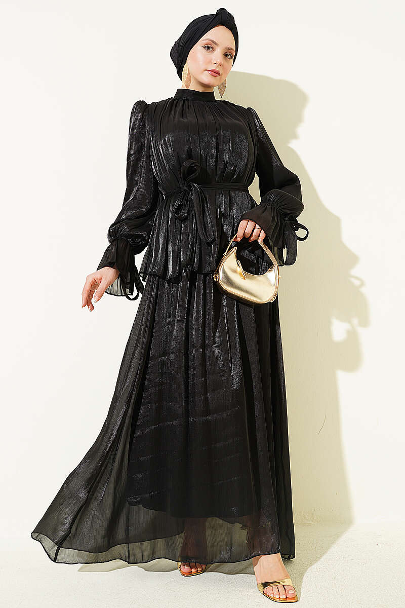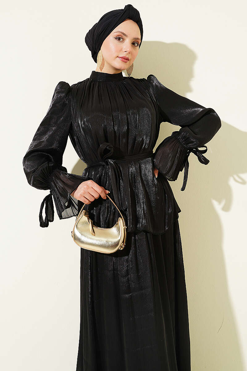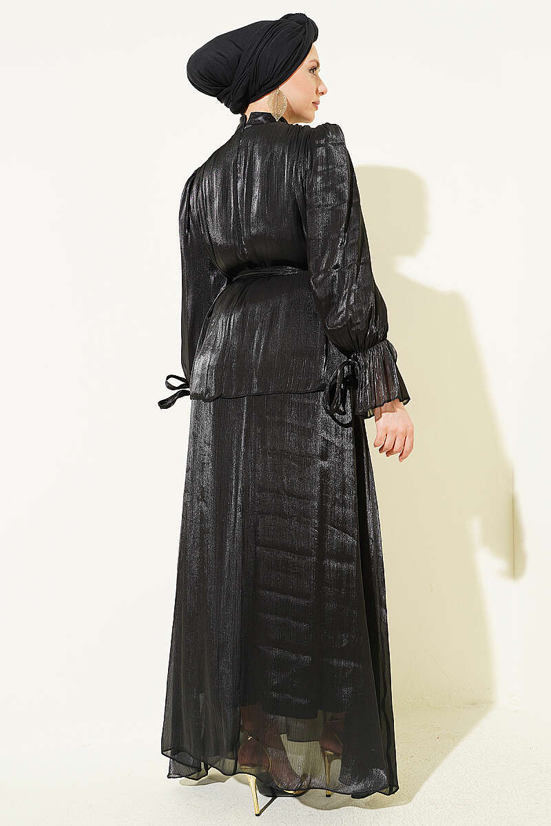 Bilek Lastikli Etekli Abiye İkili Takım Siyah