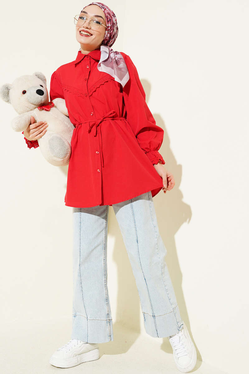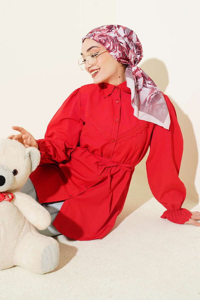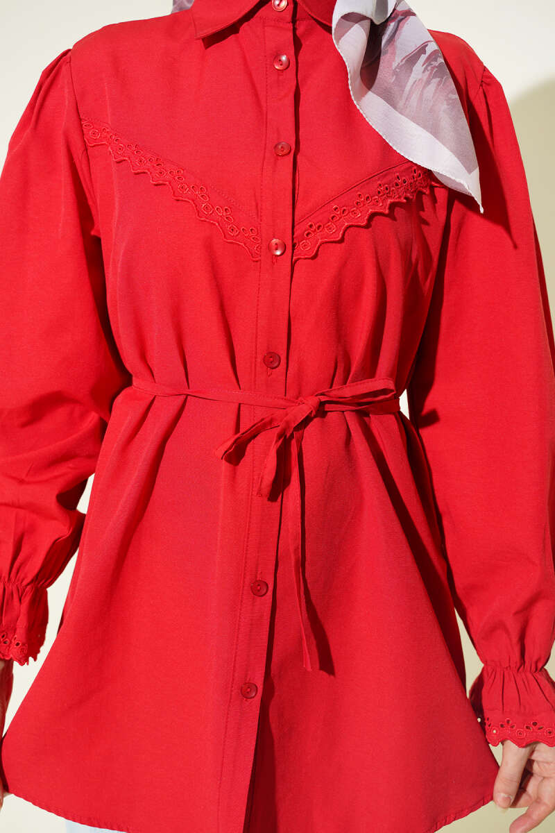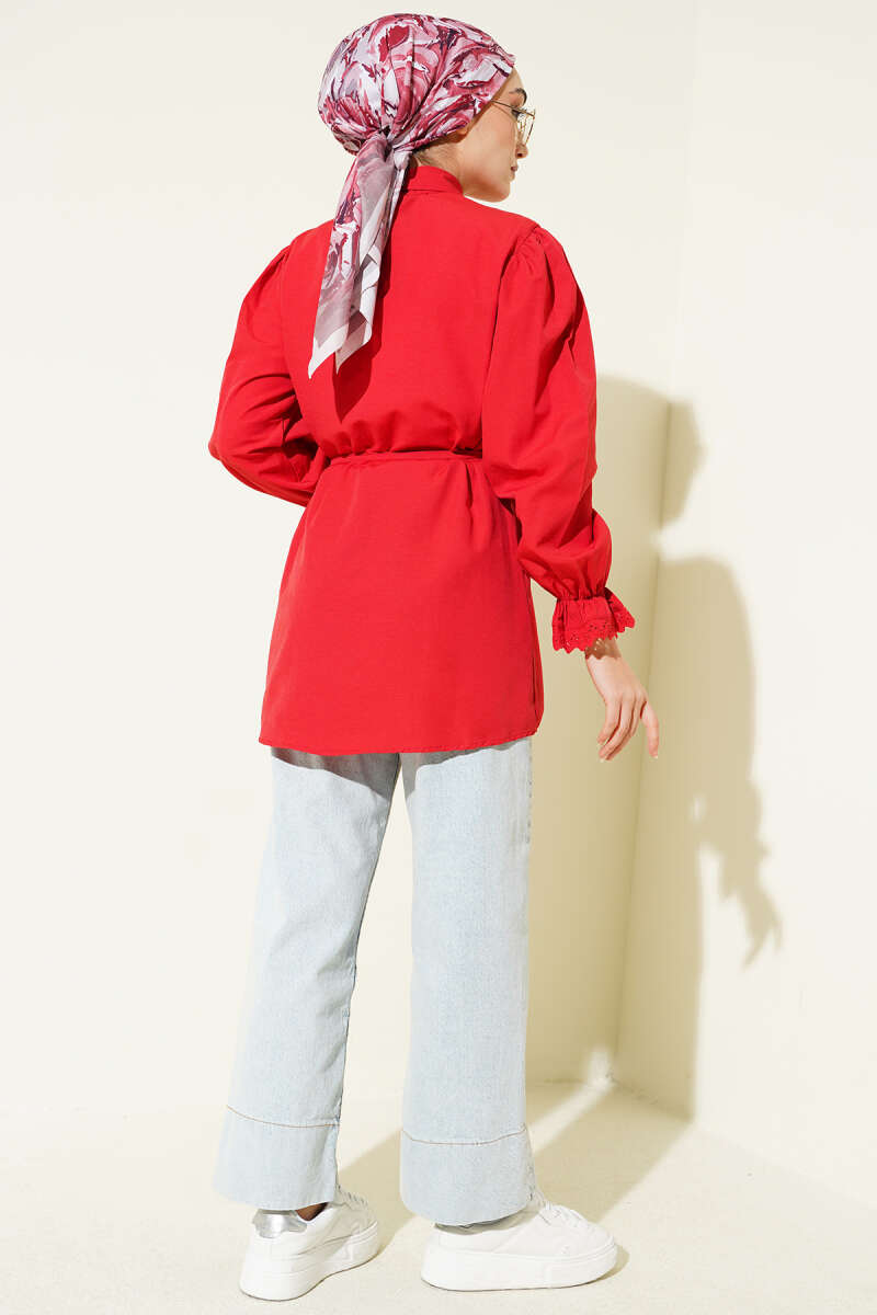 Bilek Lastikli Güpür Detaylı Gömlek Kırmızı