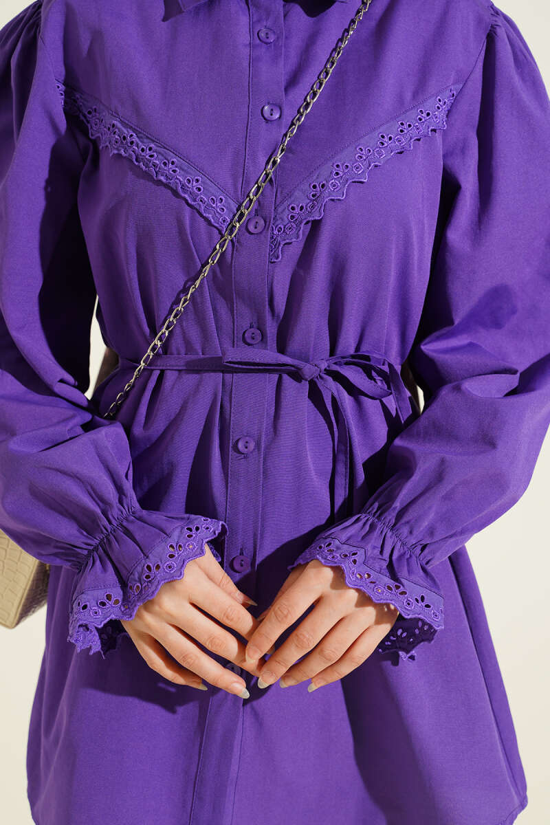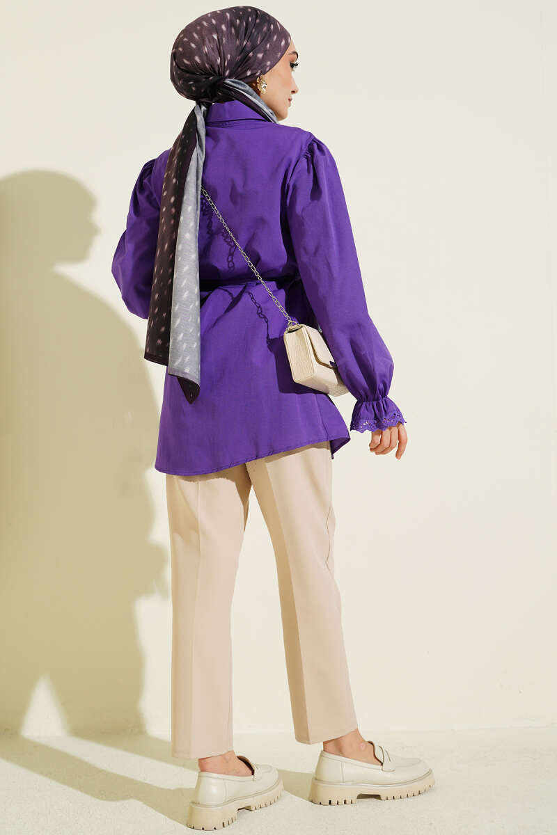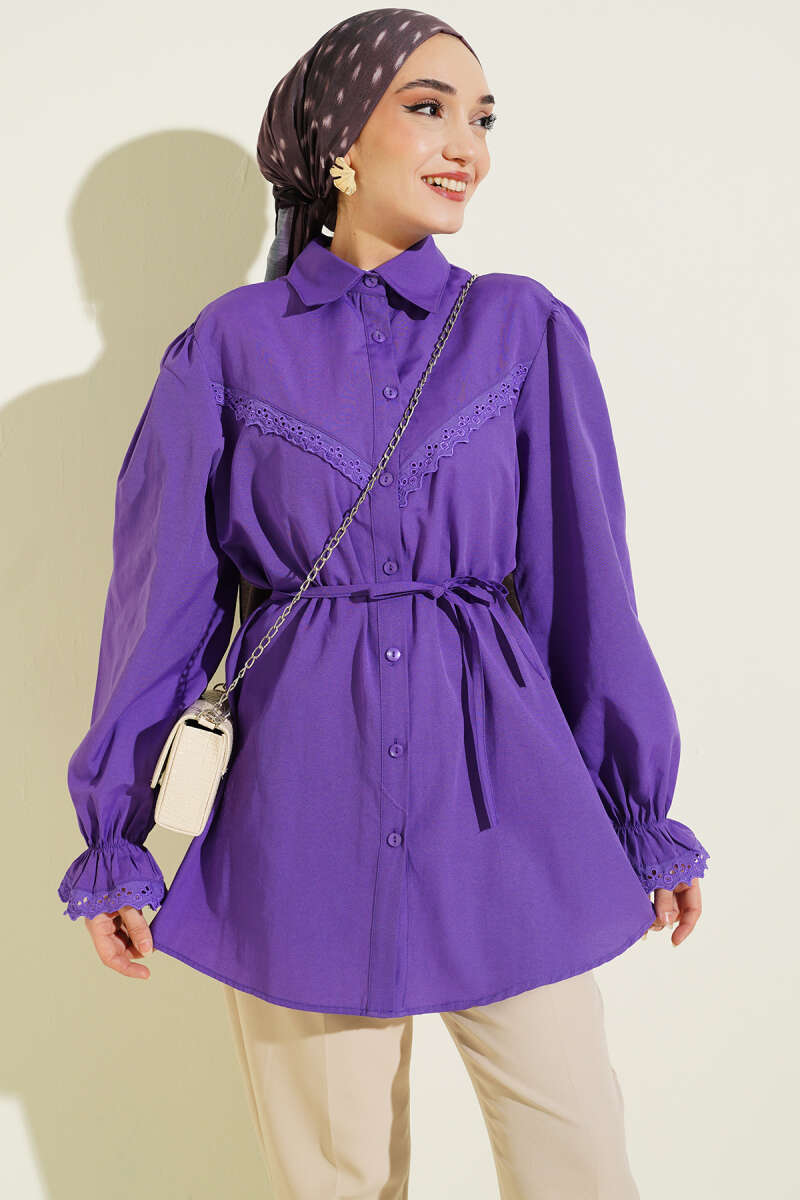 Bilek Lastikli Güpür Detaylı Gömlek Mor