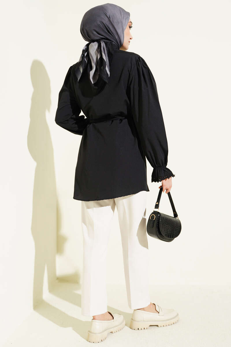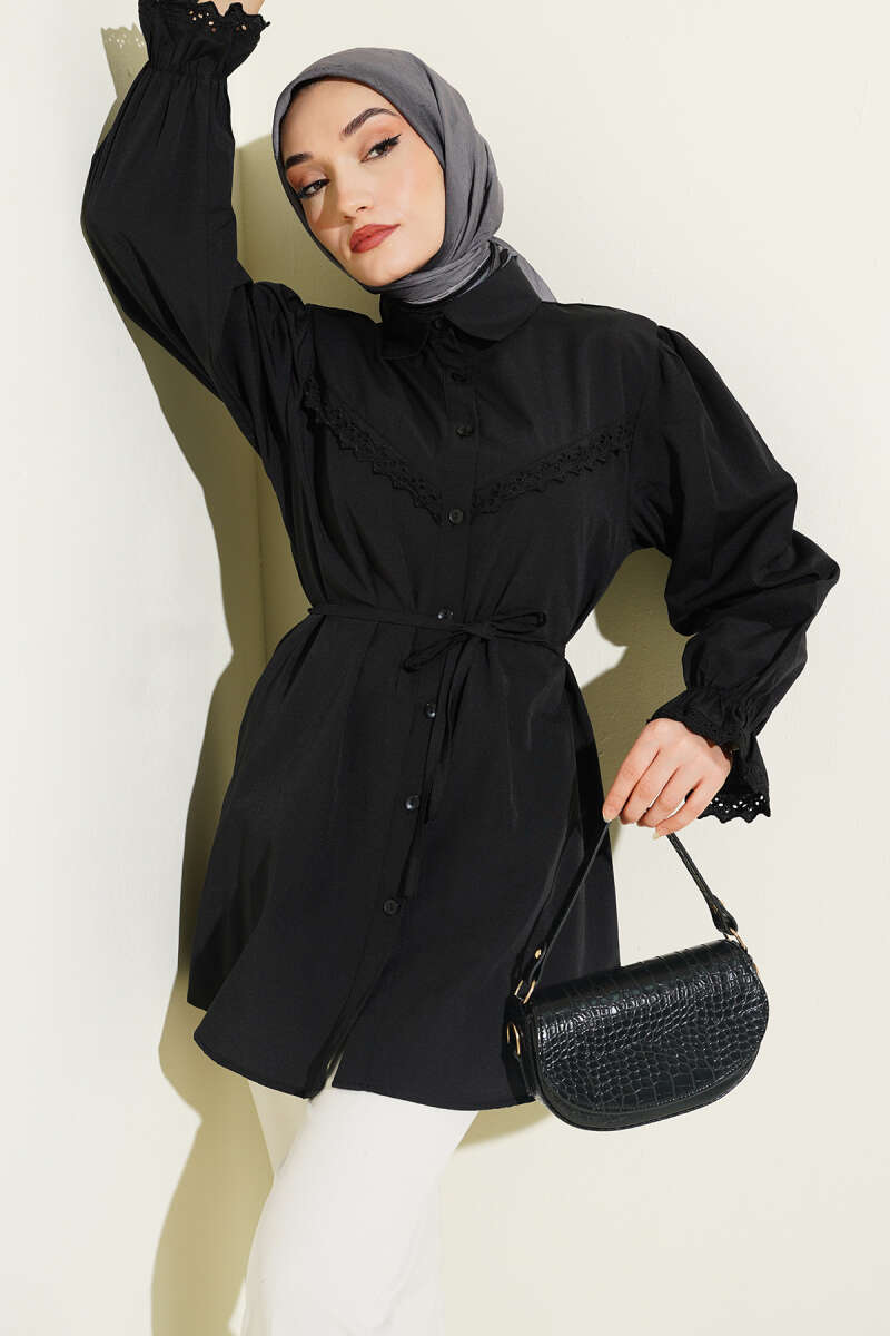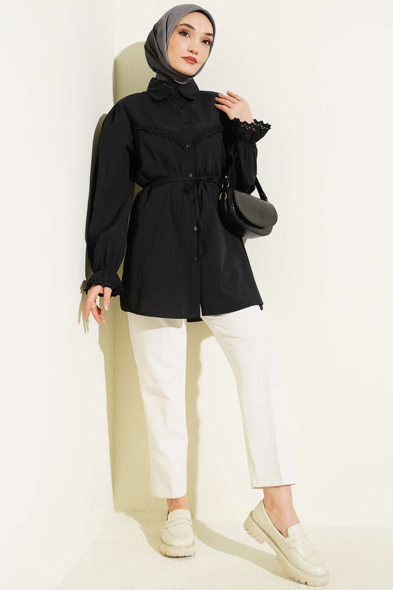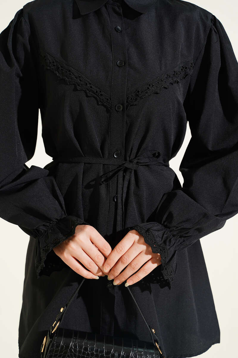 Bilek Lastikli Güpür Detaylı Gömlek Siyah