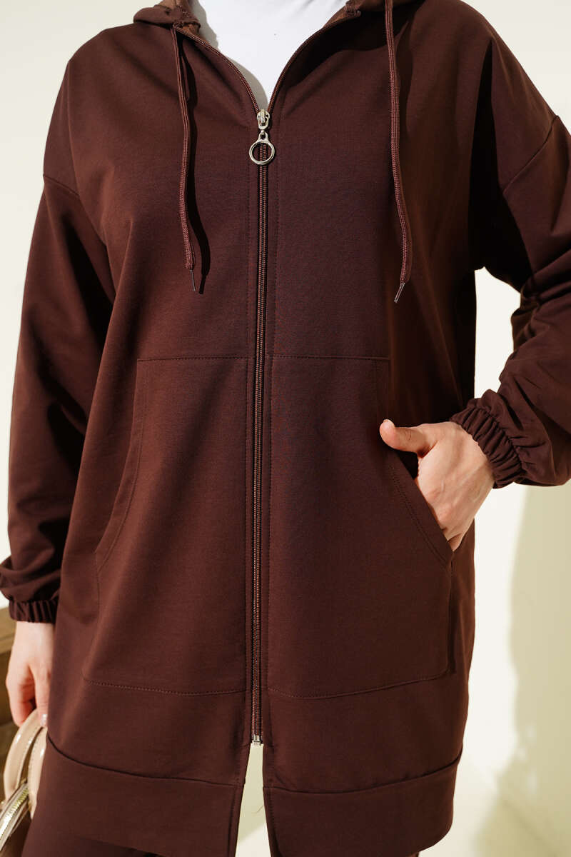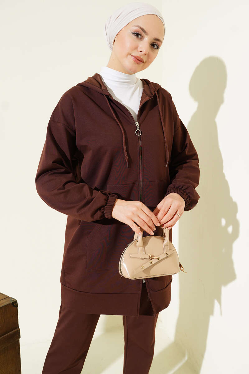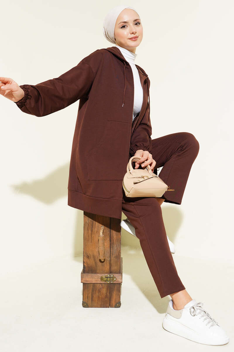Bilek Lastikli Kapüşonlu İkili Takım Kahve