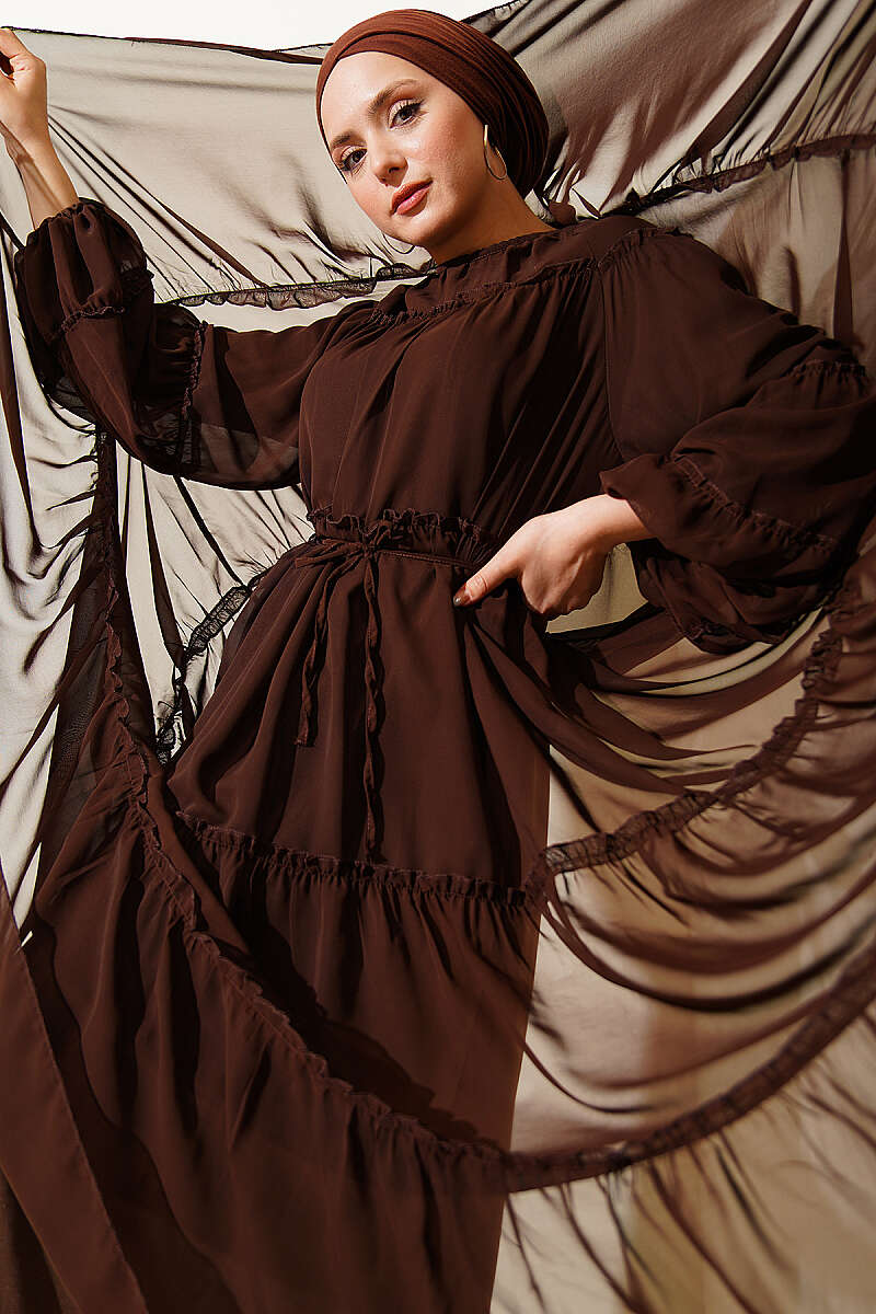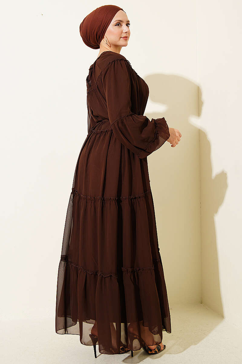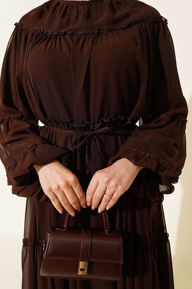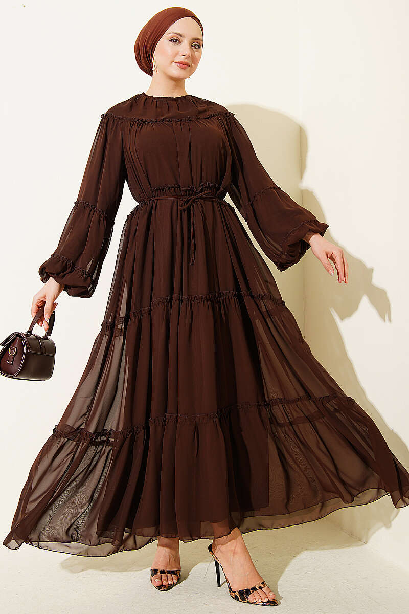 Bilek Lastikli Kat Kat Şifon Elbise Acı Kahve