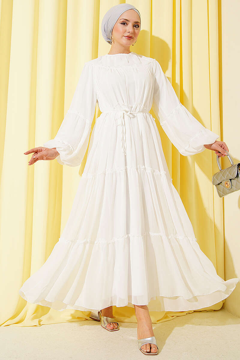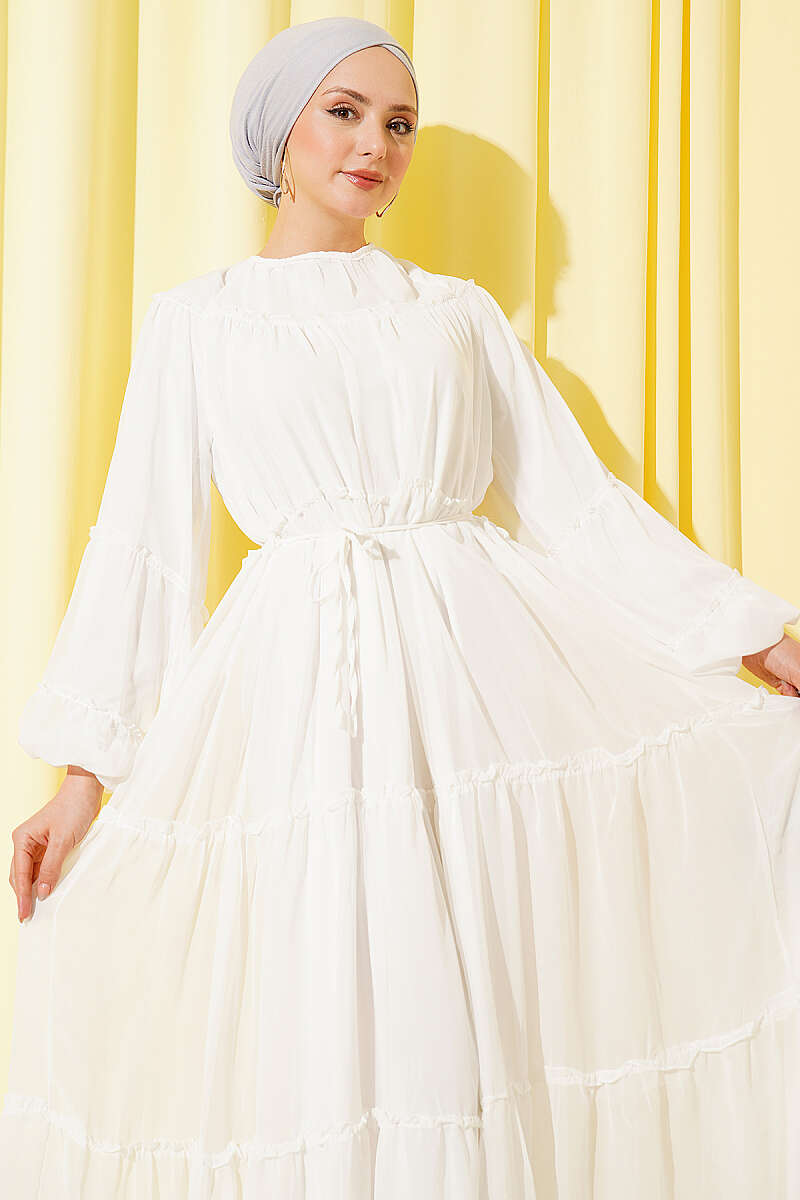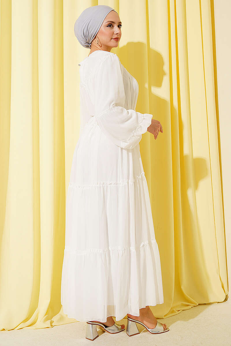 Bilek Lastikli Kat Kat Şifon Elbise Ekru