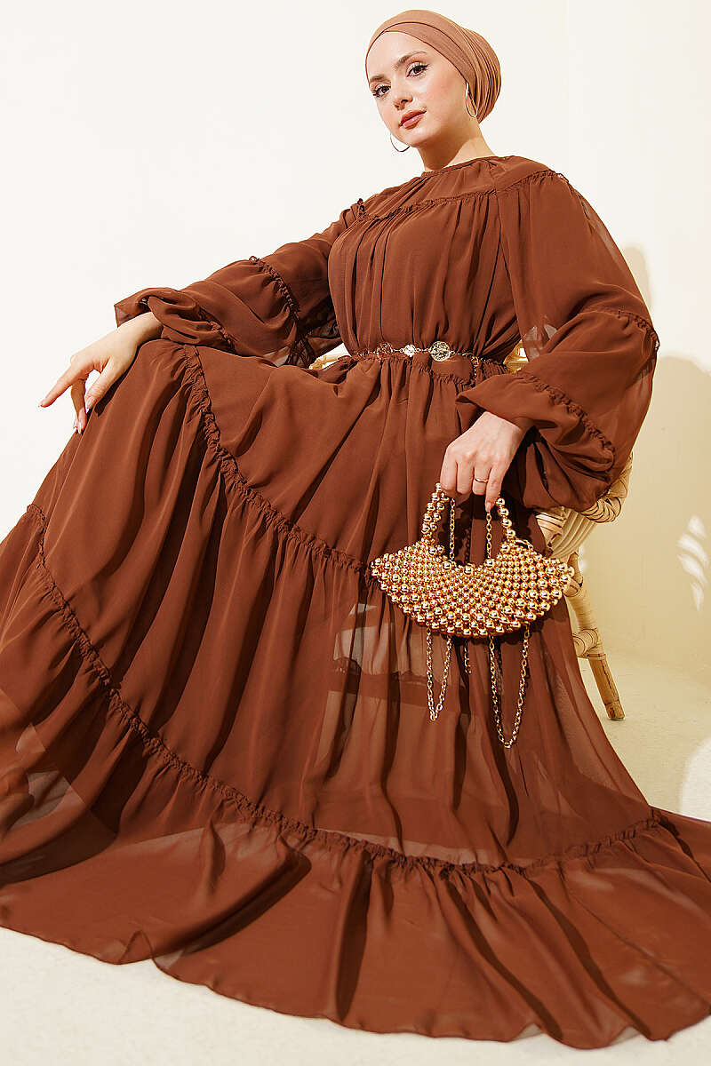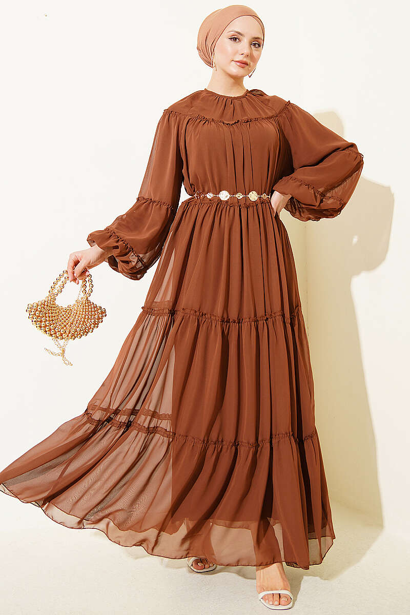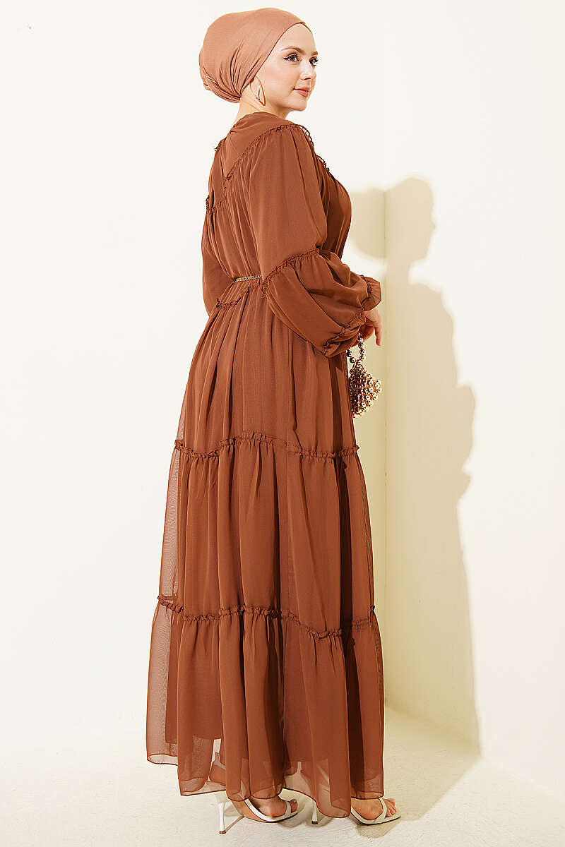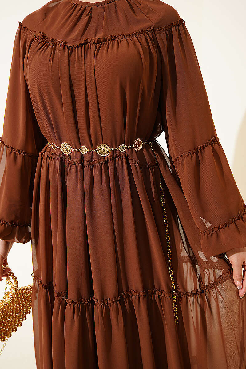 Bilek Lastikli Kat Kat Şifon Elbise Kahve