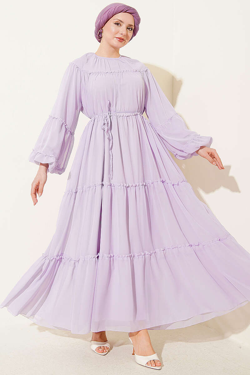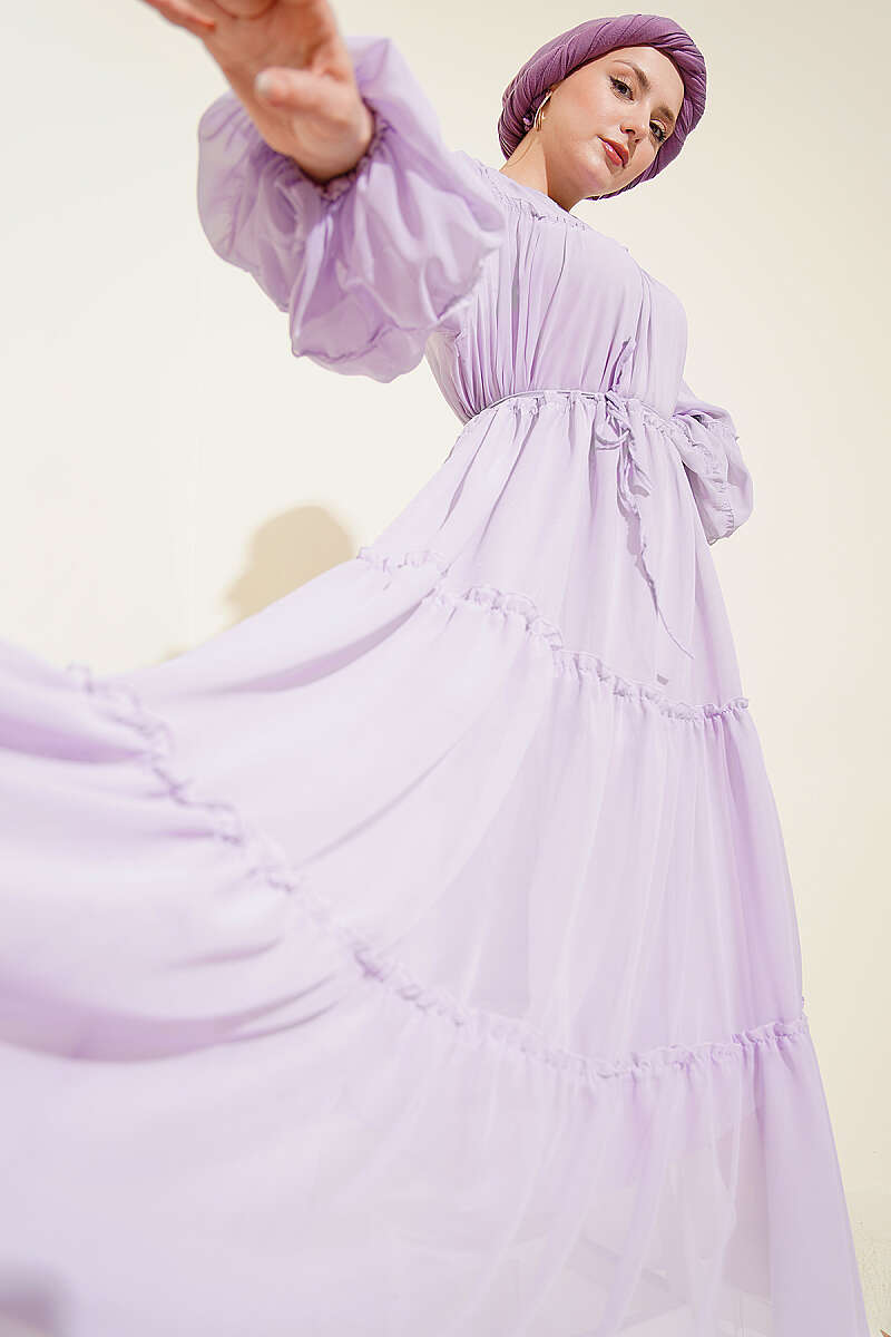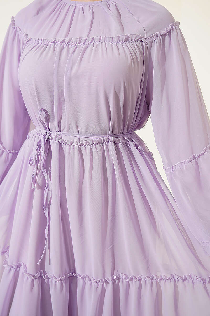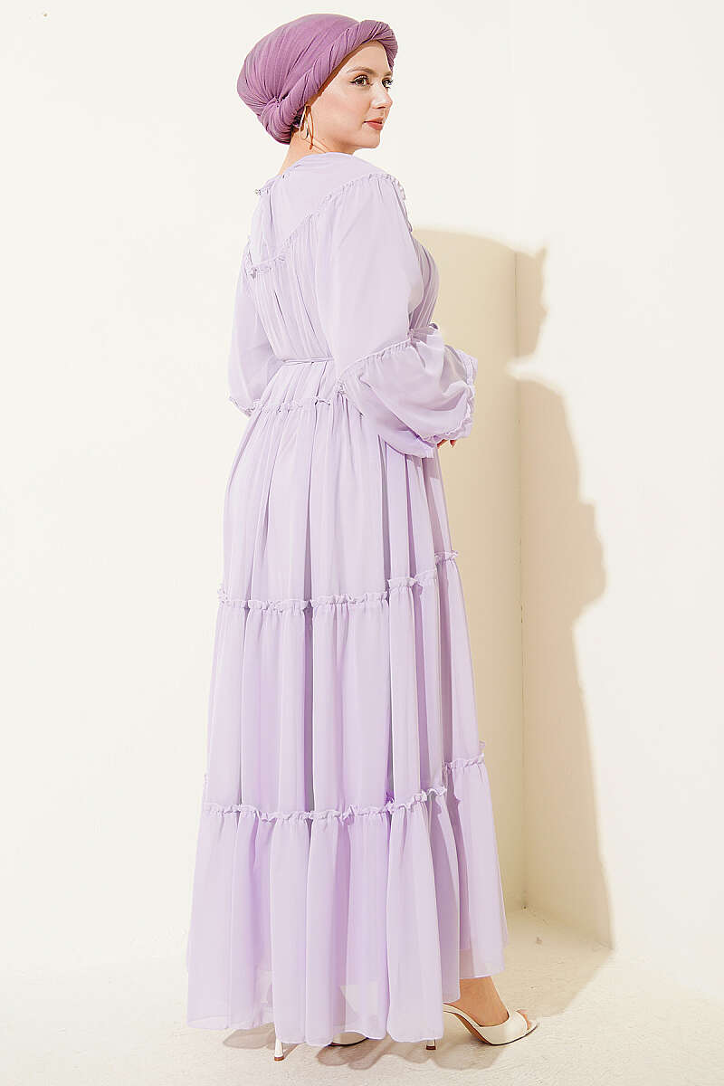 Bilek Lastikli Kat Kat Şifon Elbise Lila