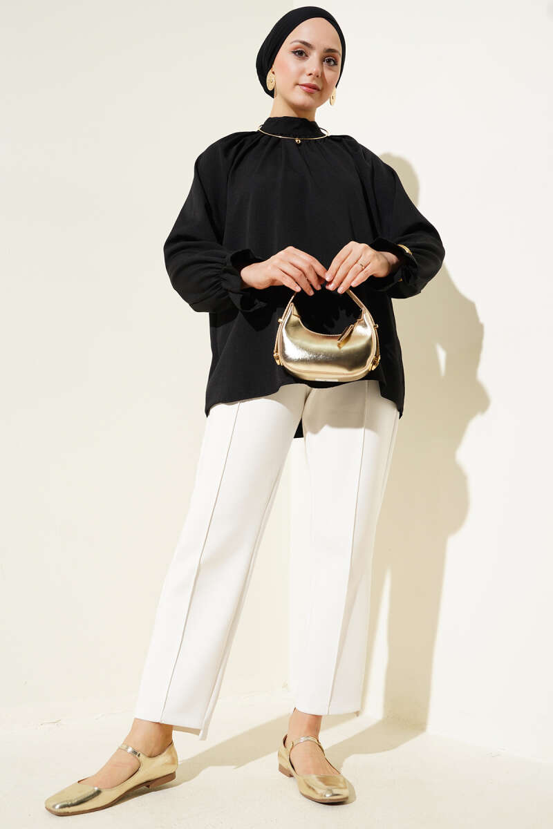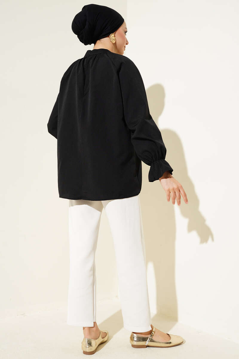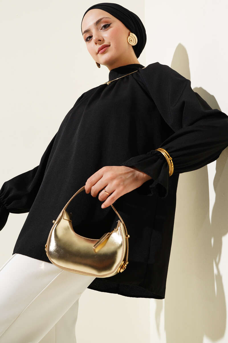 Bilek Lastikli Yaka Pileli Tunik Siyah