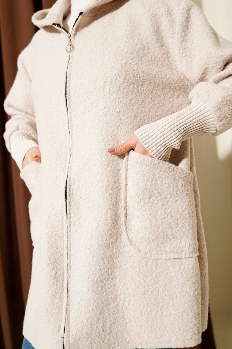 Bilek Ribanalı Kapüşonlu Buklet Hırka Kahve