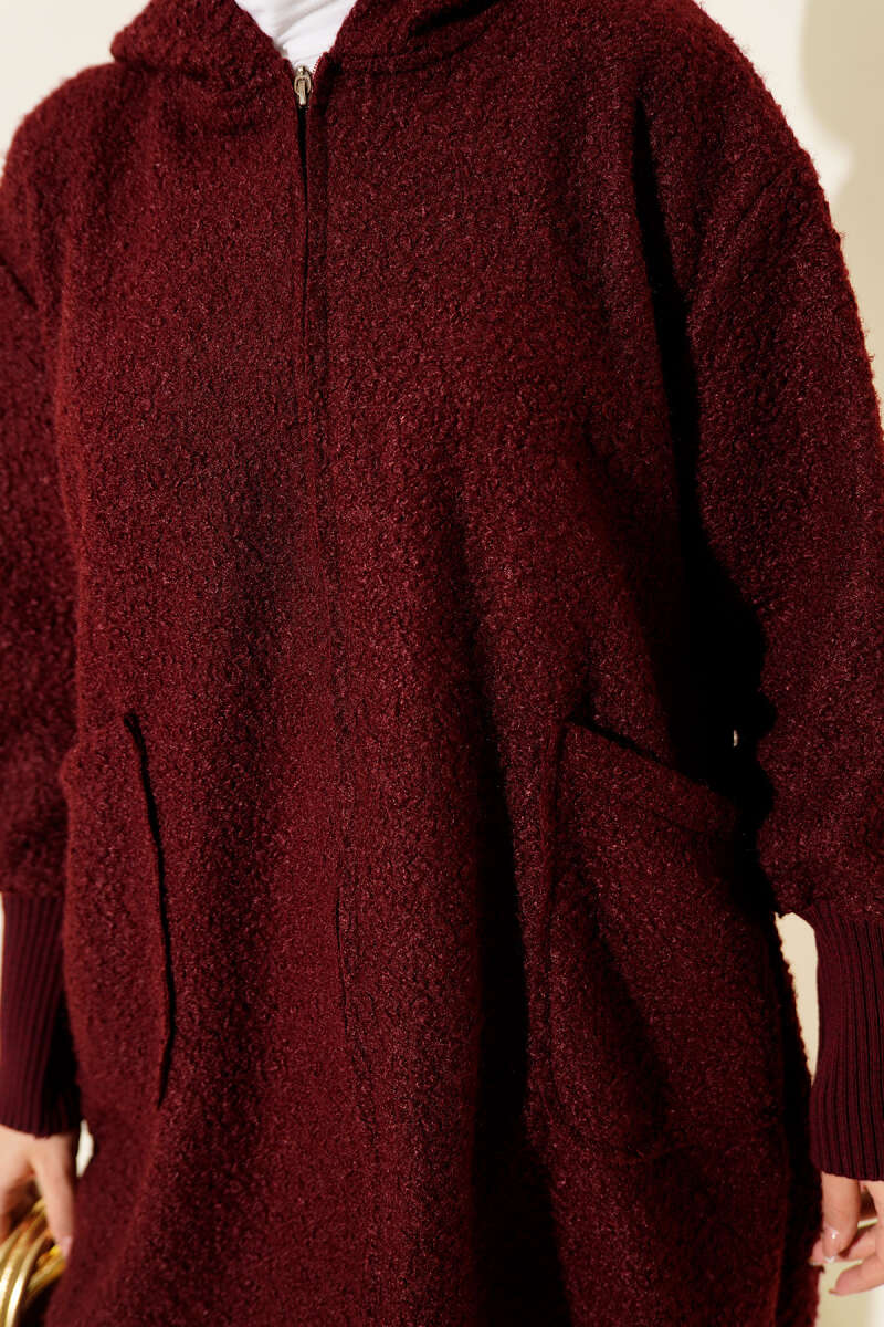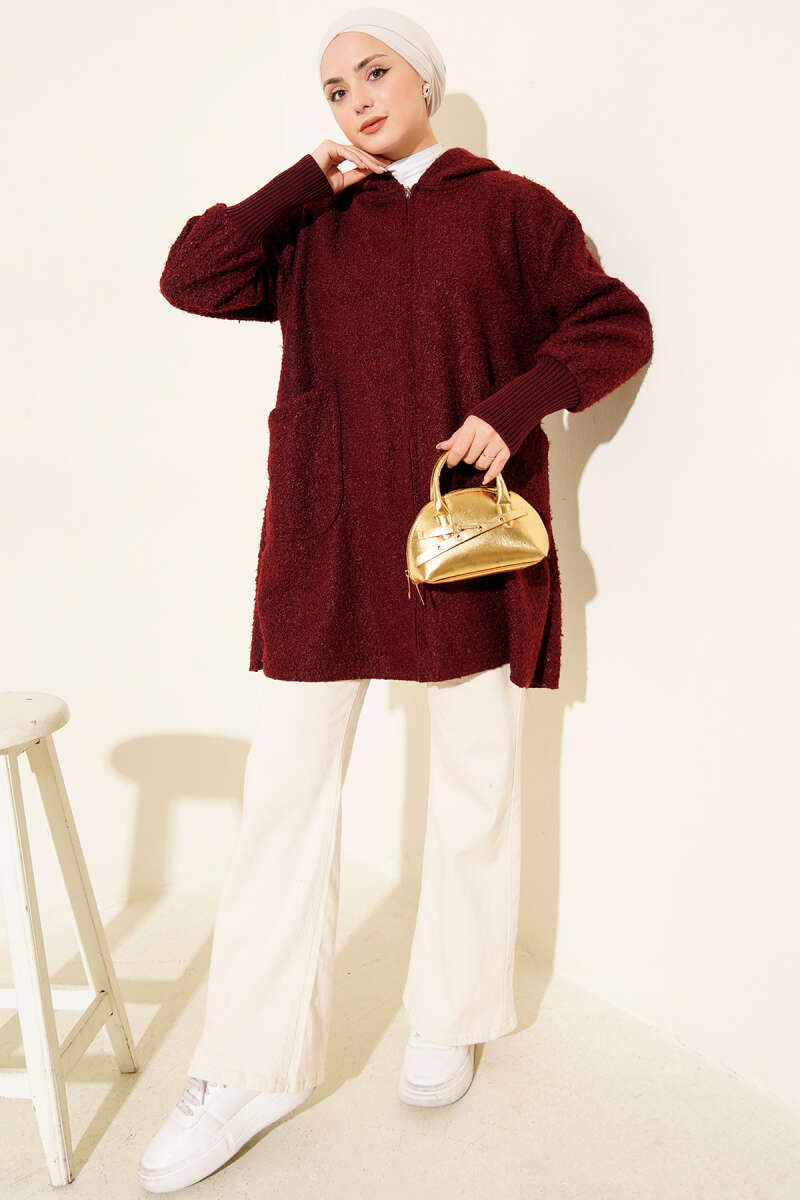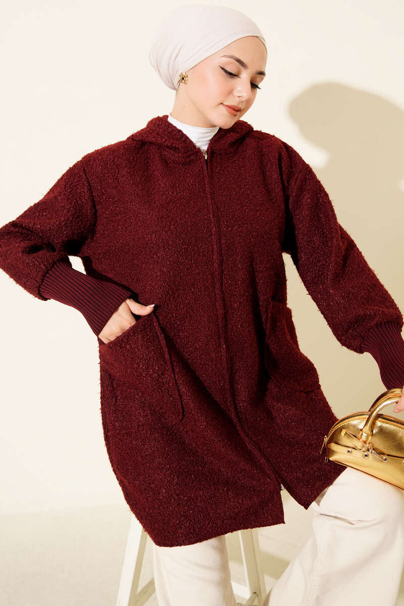Bilek Ribanalı Kapüşonlu Buklet Hırka Kahve