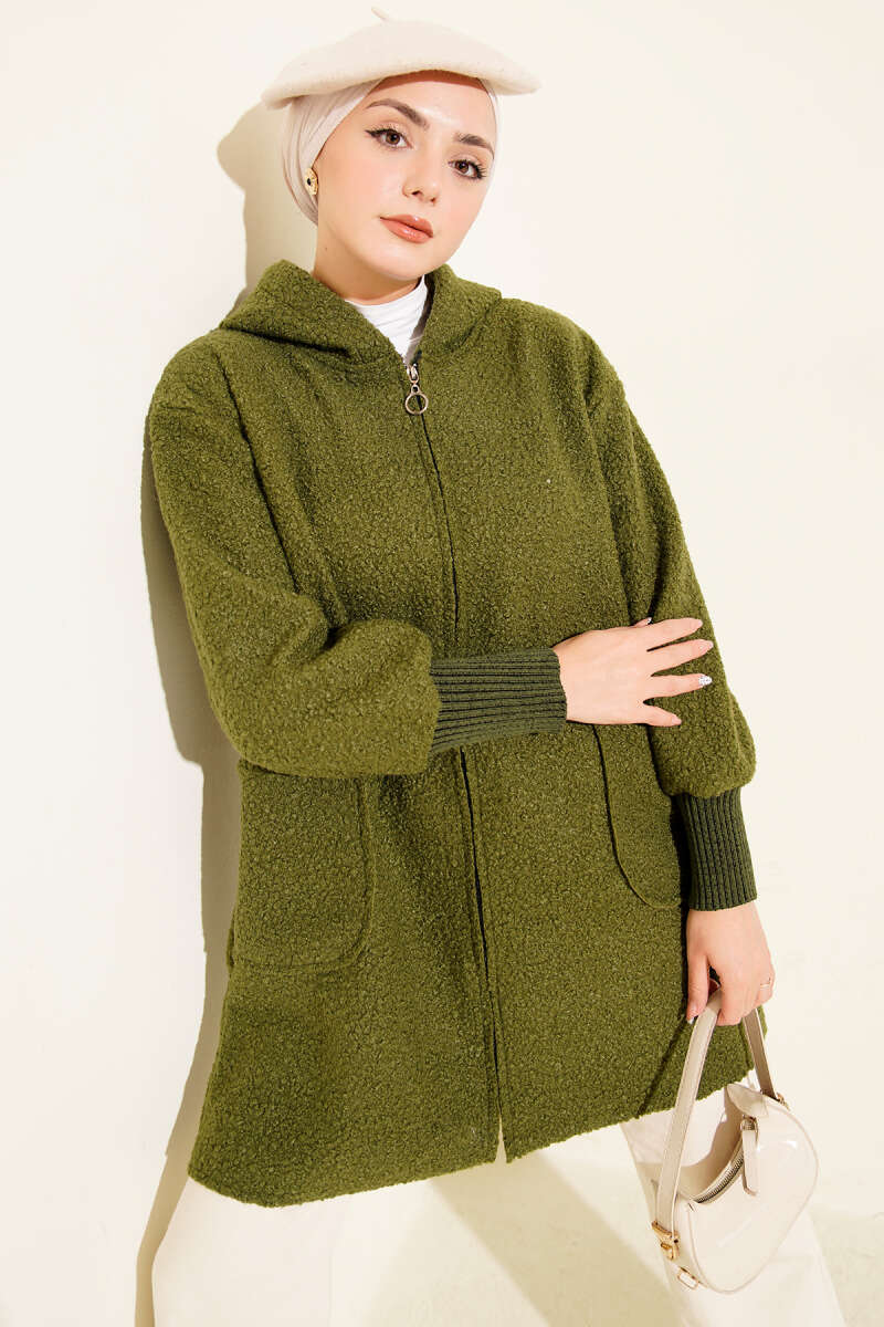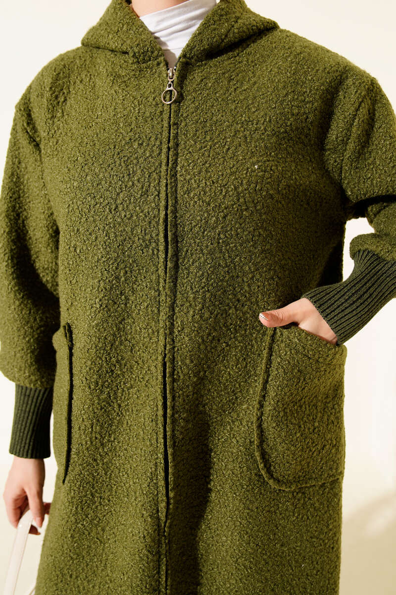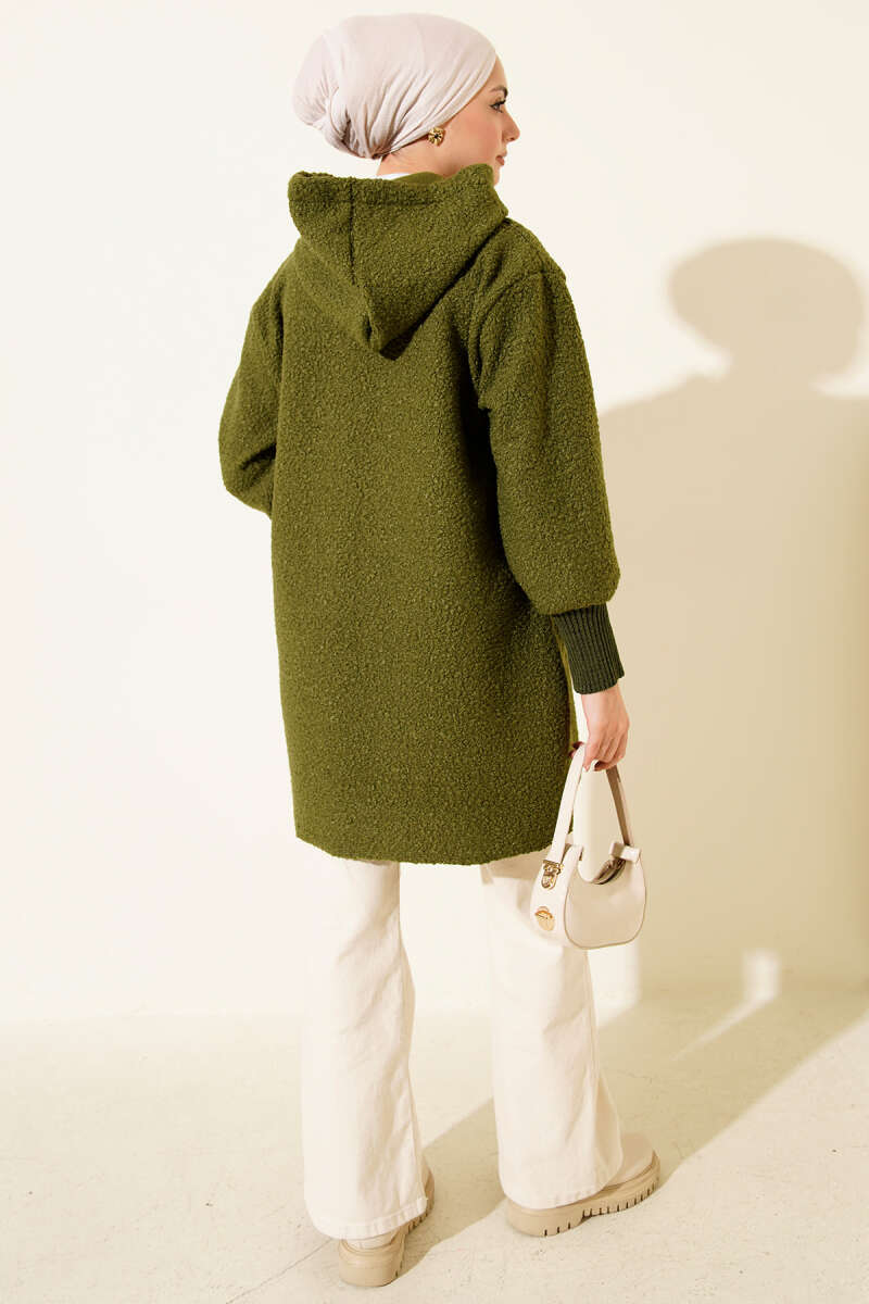 Kabartma Desenli Triko Uzun Hırka Haki