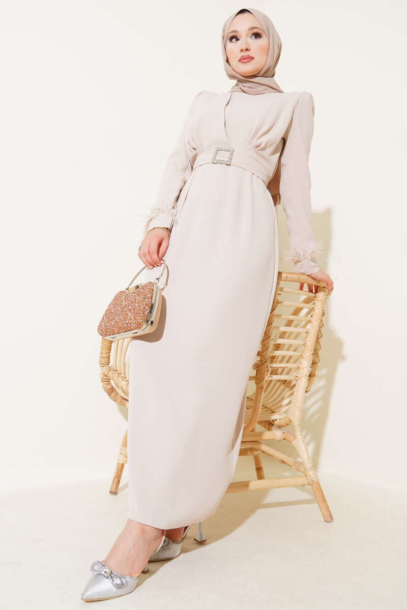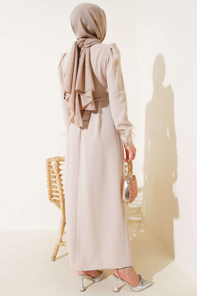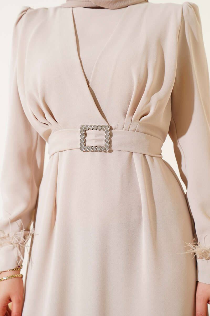 Çizgi Gömlek Garnili Triko Elbise Bej