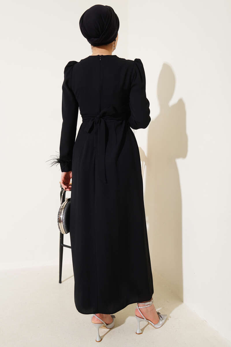 Bilek Tüylü Kemerli Elbise Bordo