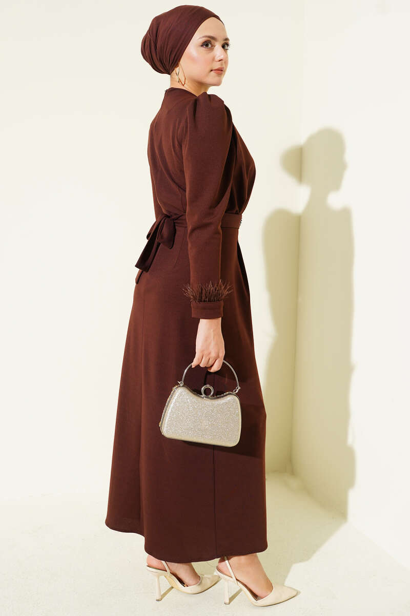Bilek Tüylü Kuşaklı Abiye Elbise Bordo