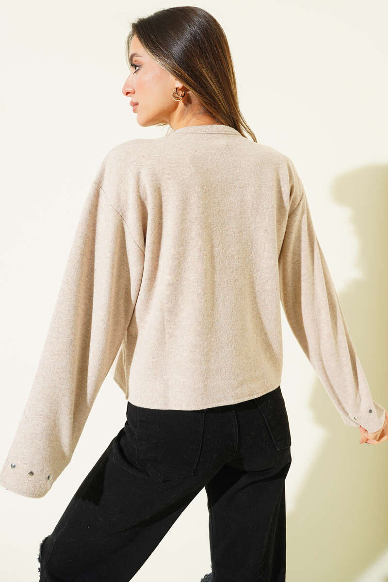 Kuşaklı Kruvaze Yaka Cepli Kaşe Kaban Bej