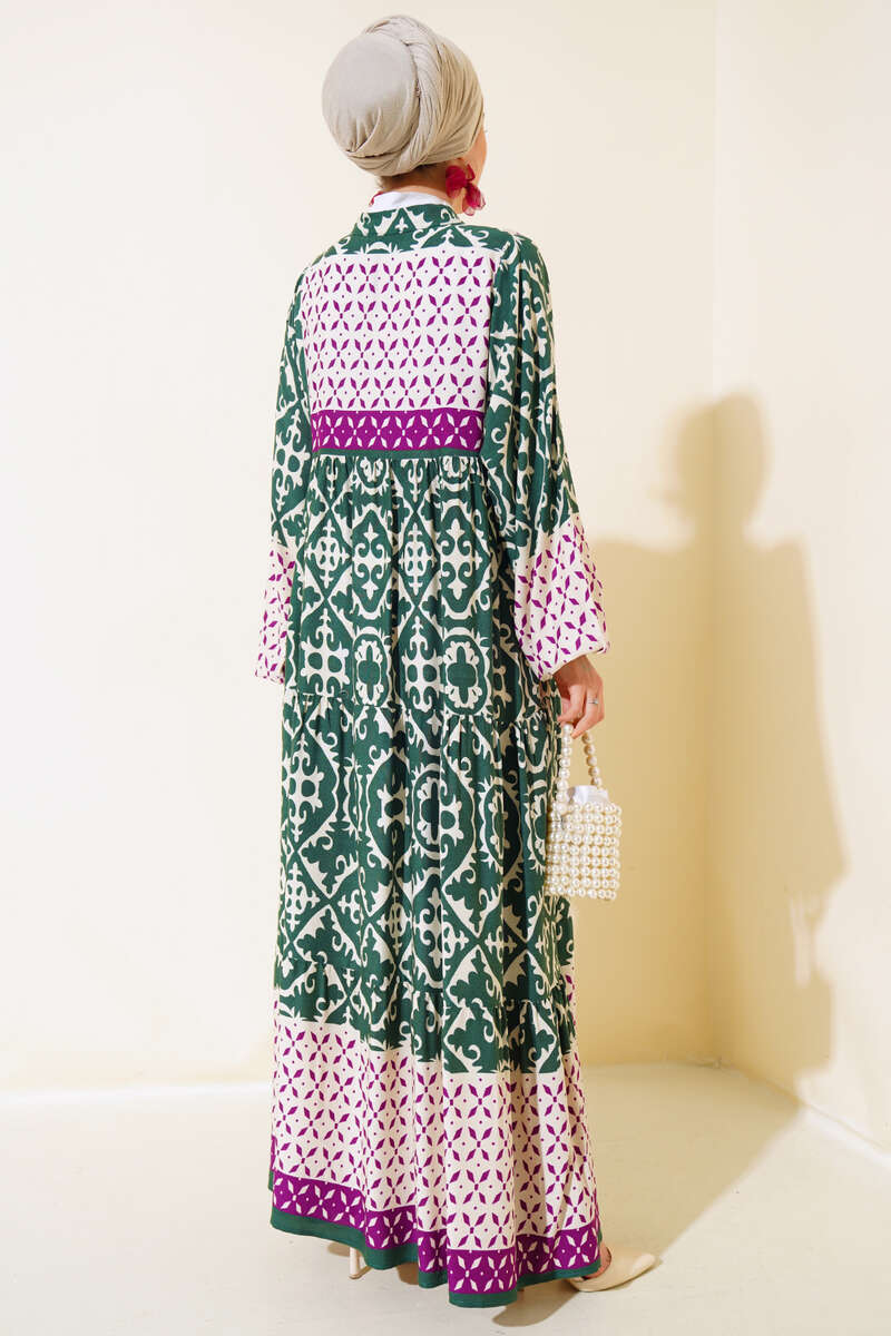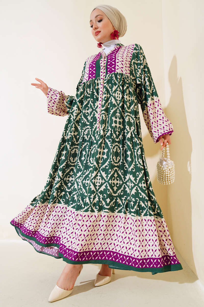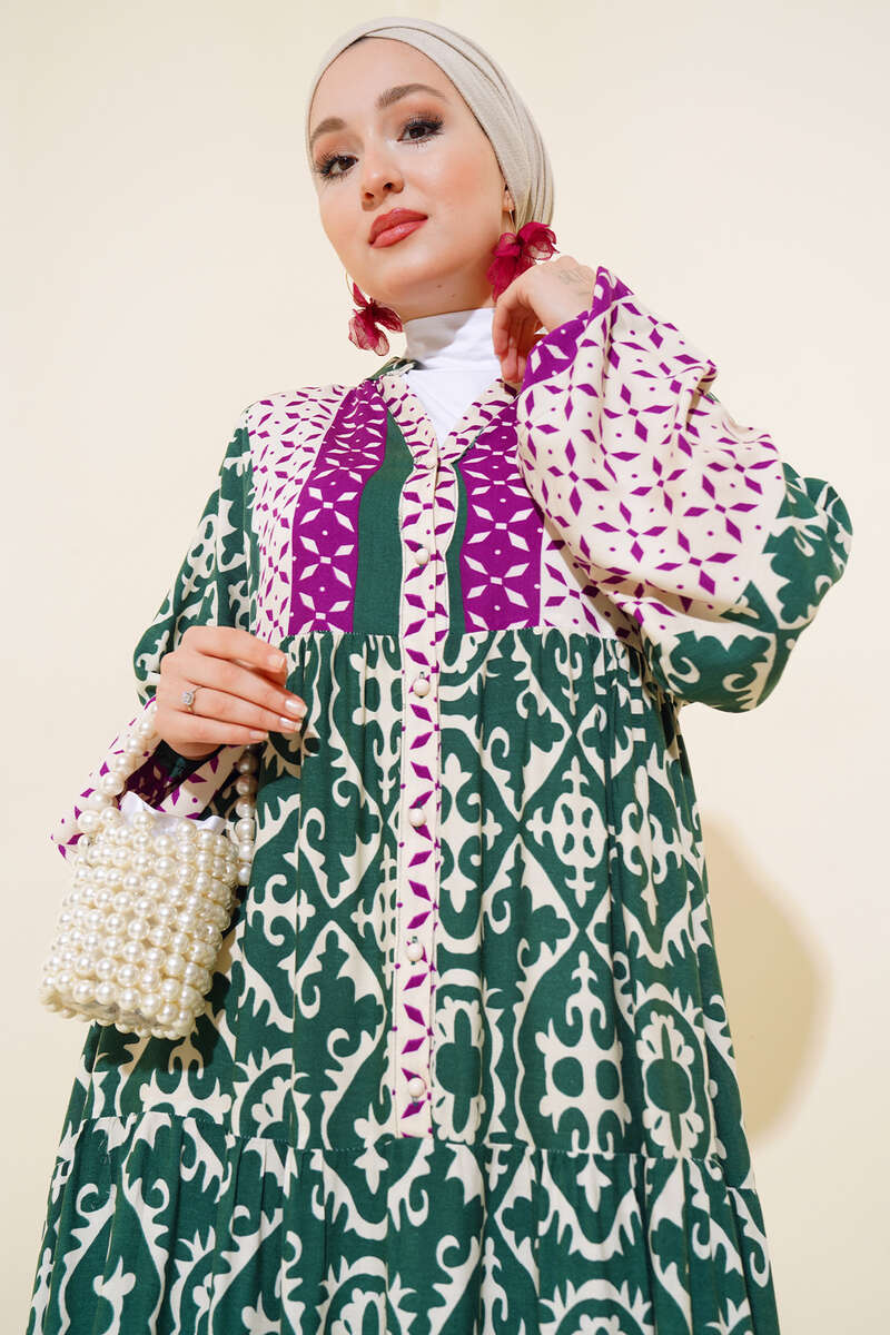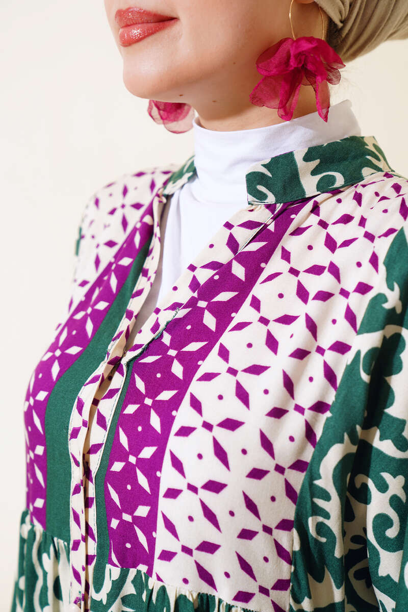Bilekleri Lastikli Desenli Elbise Haki Lila