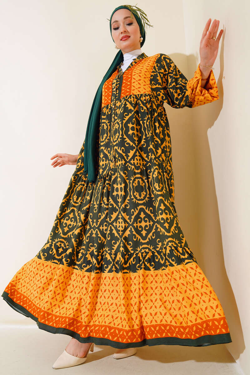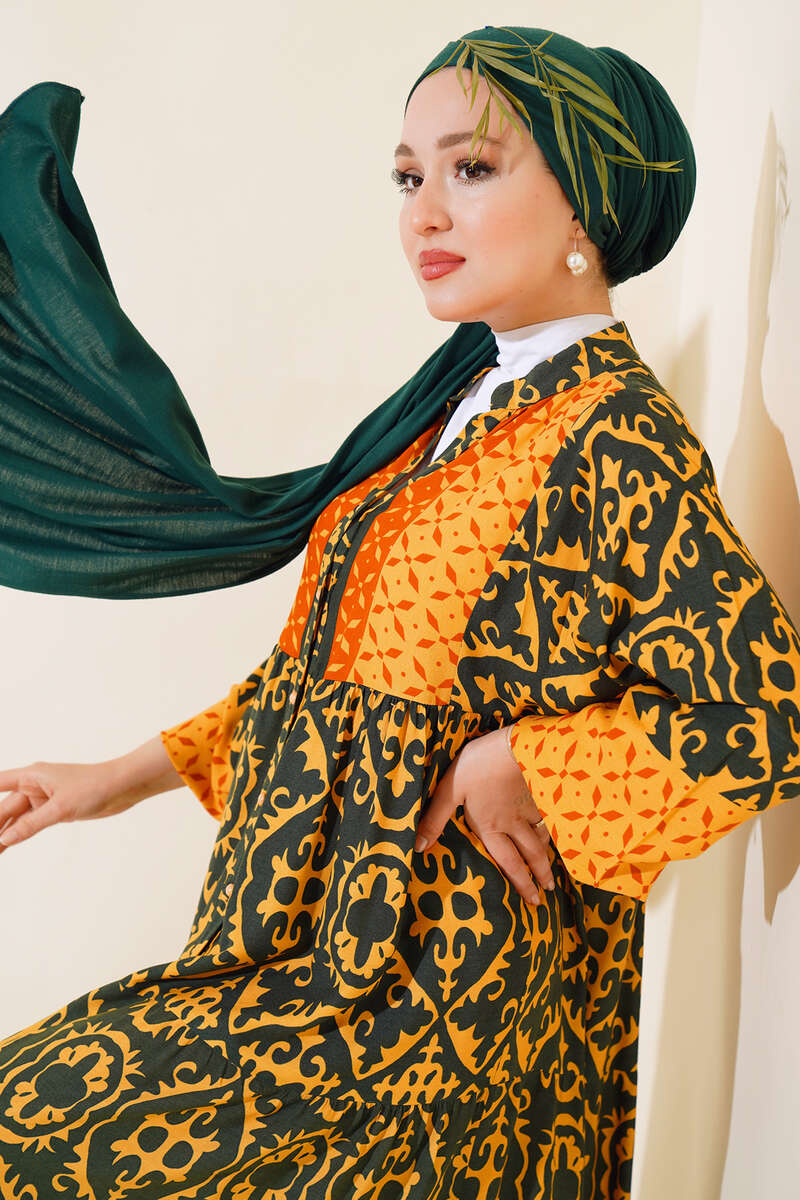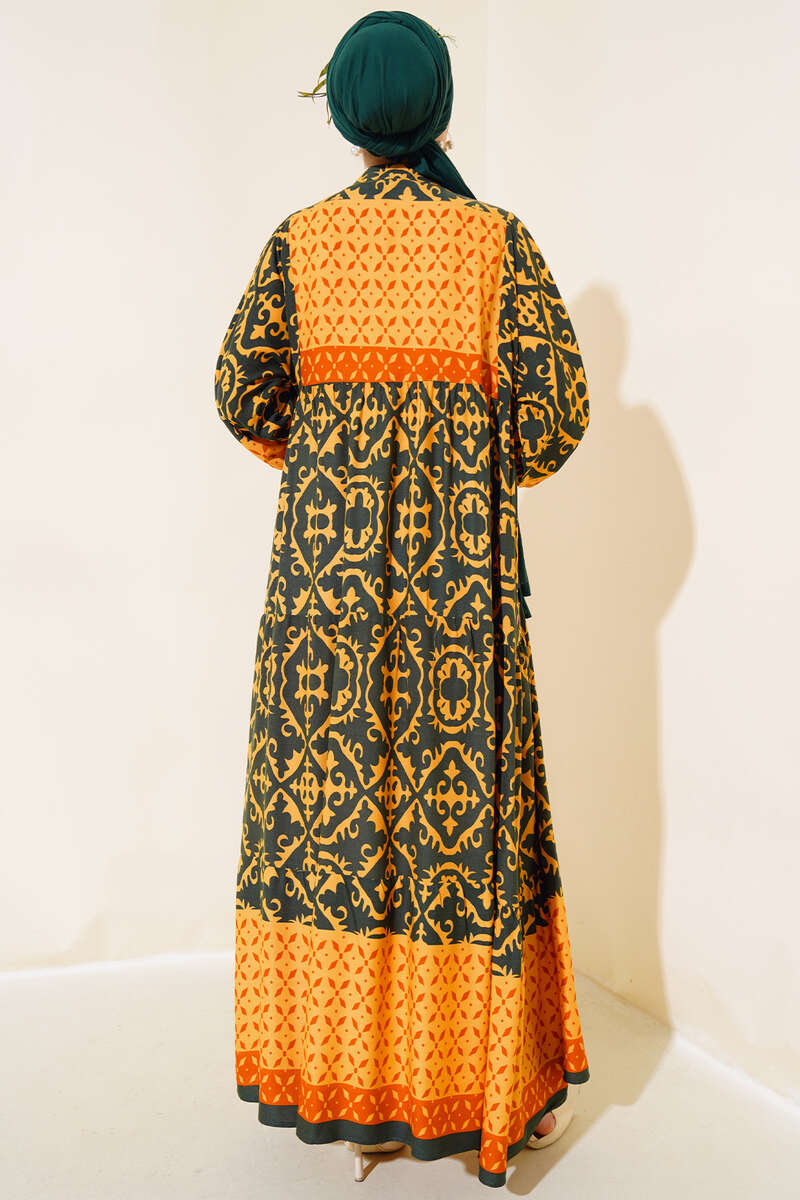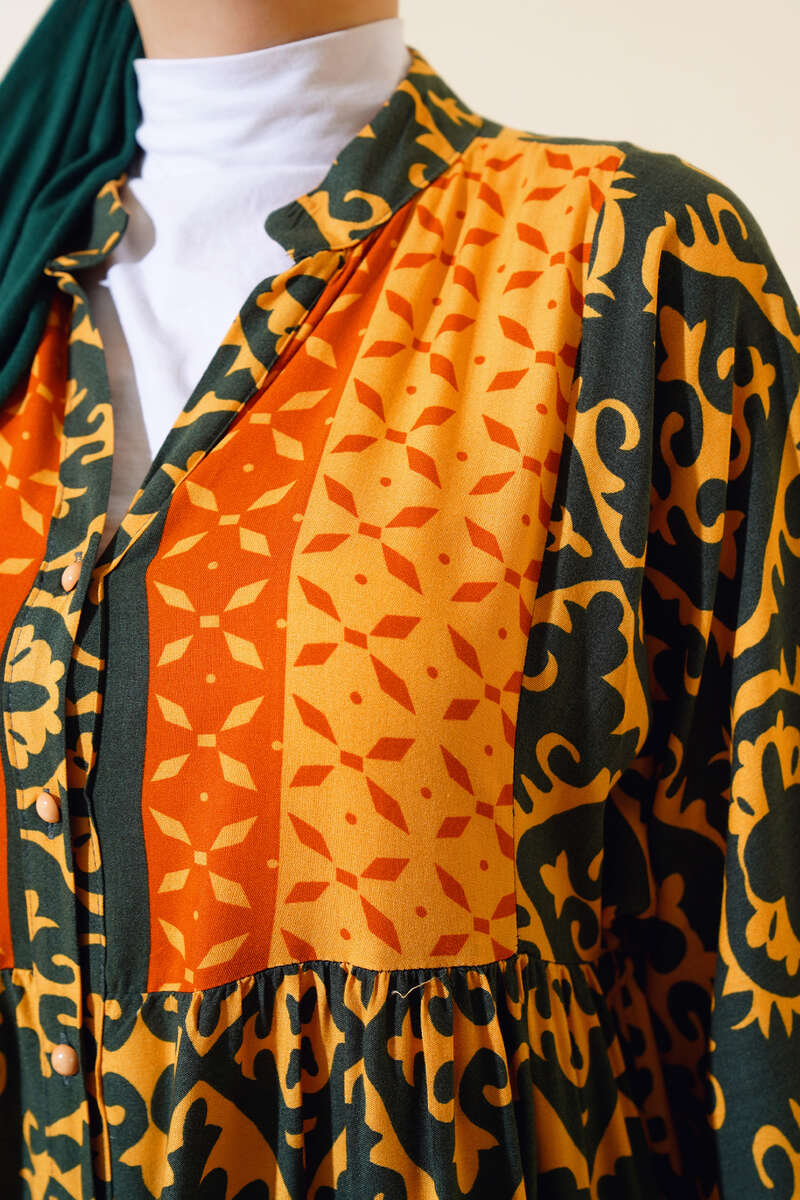 Bilekleri Lastikli Desenli Elbise Hardal Haki