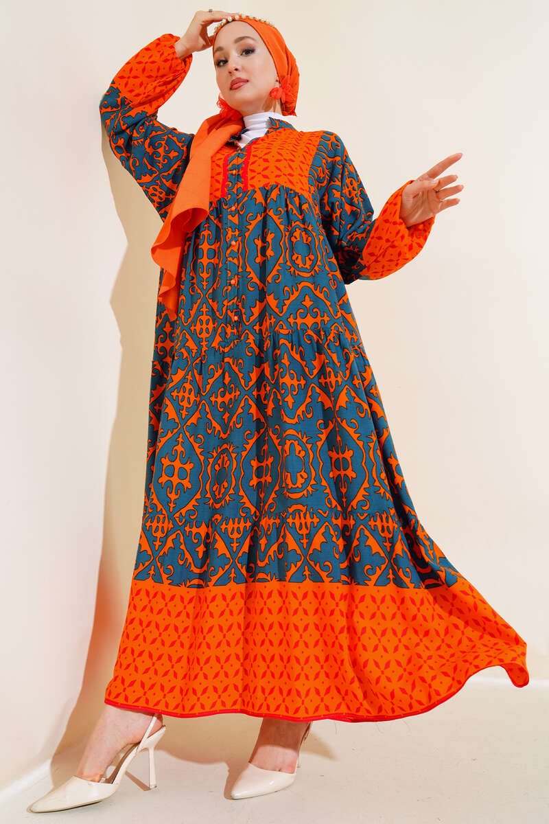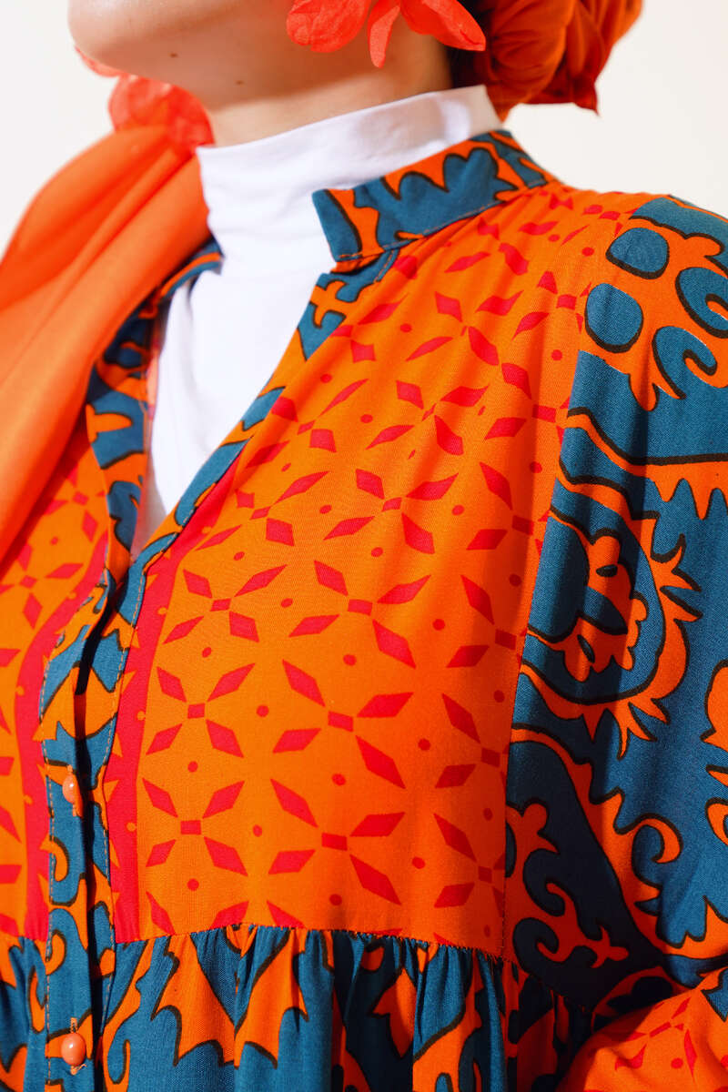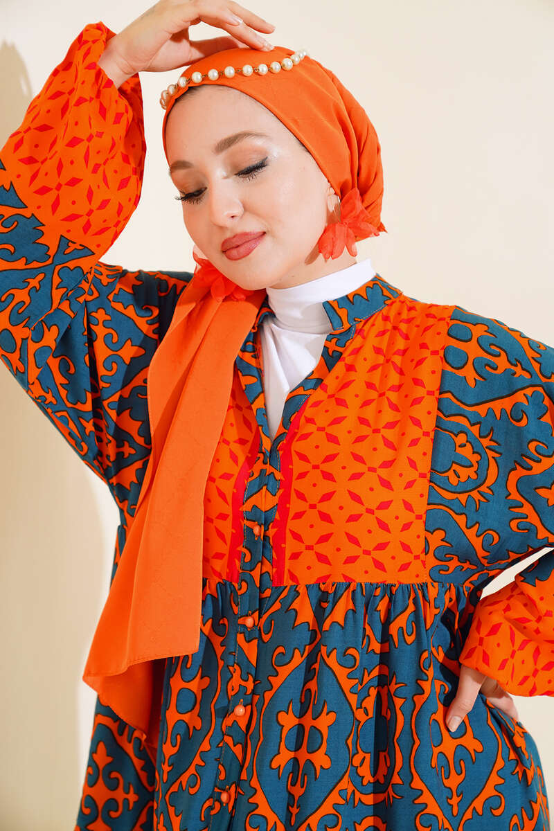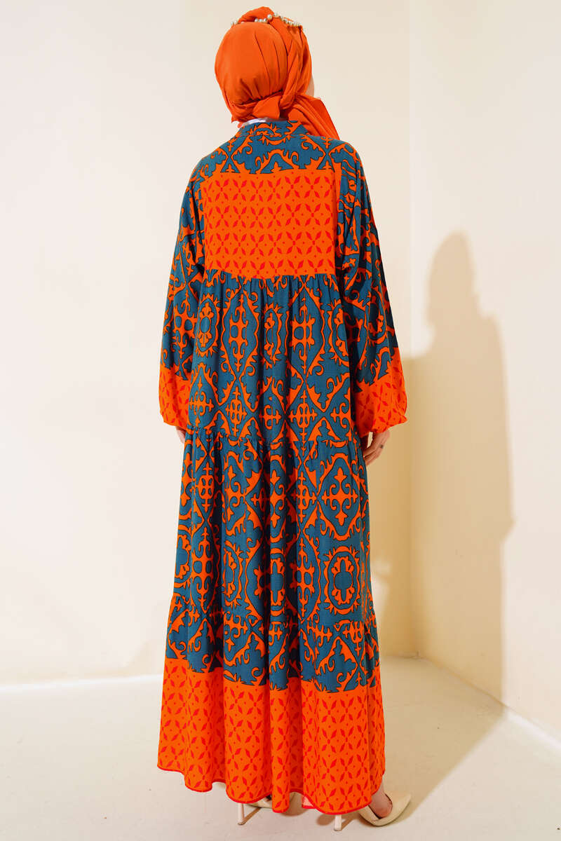 Bilekleri Lastikli Desenli Elbise Oranj Füme