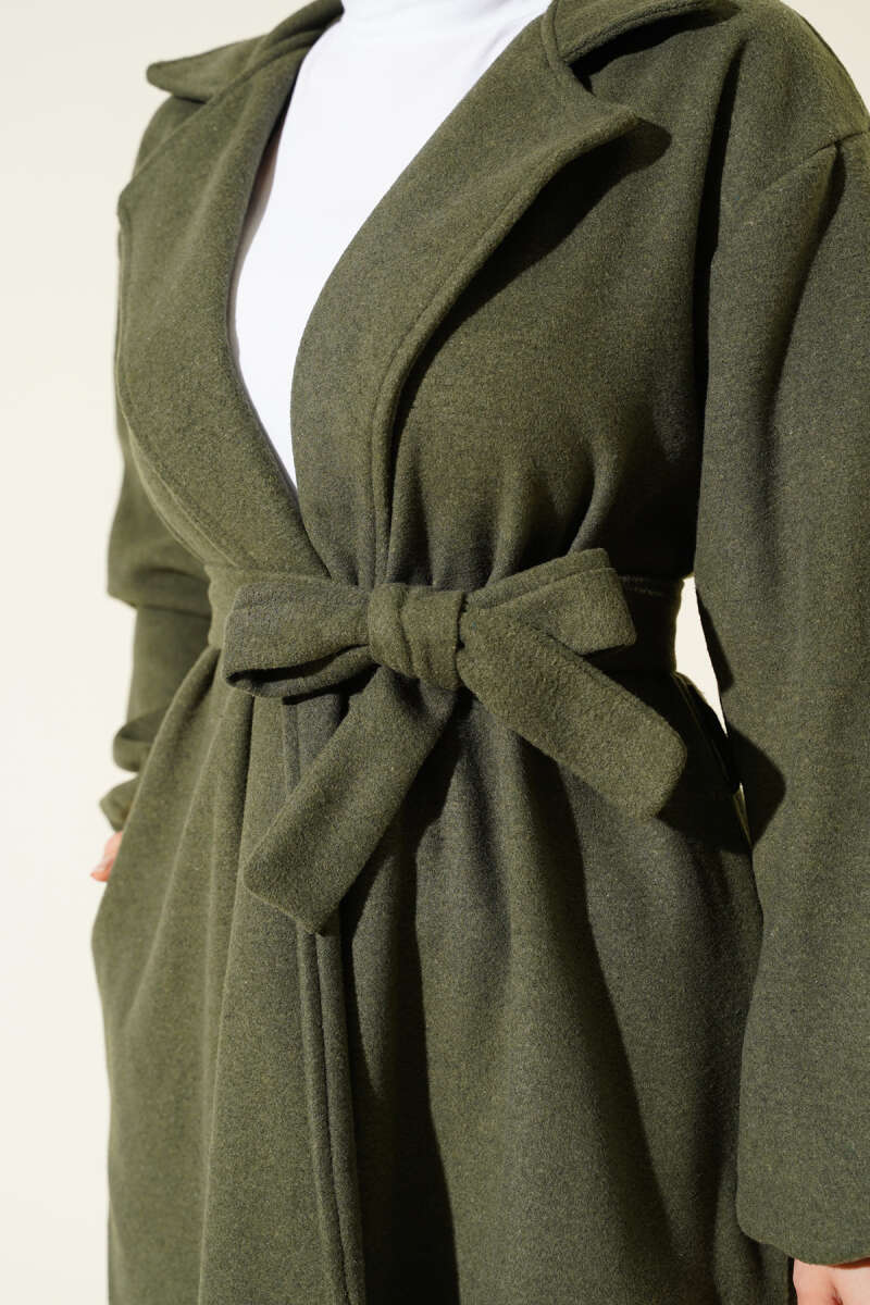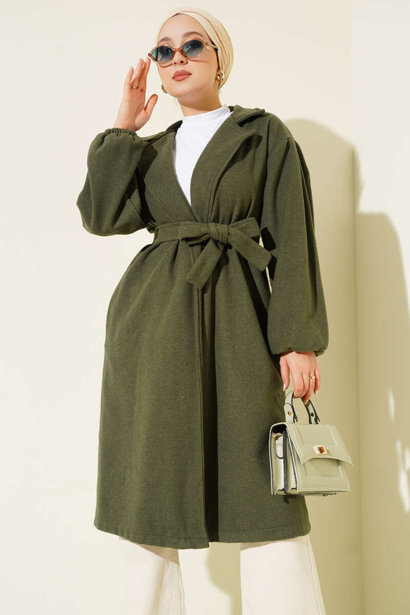 Cepli Kuşaklı Kruvaze Yaka Kaşe Kaban Haki