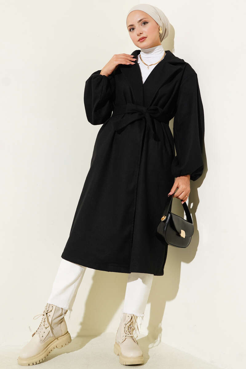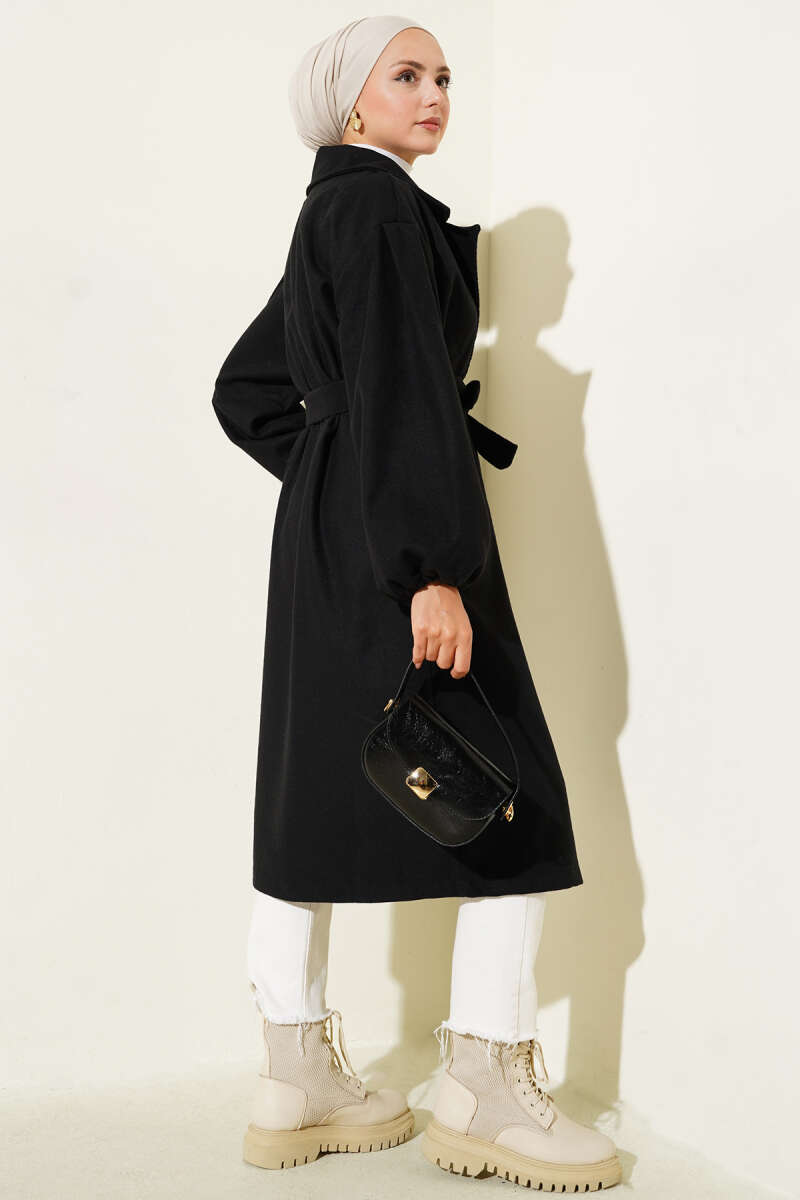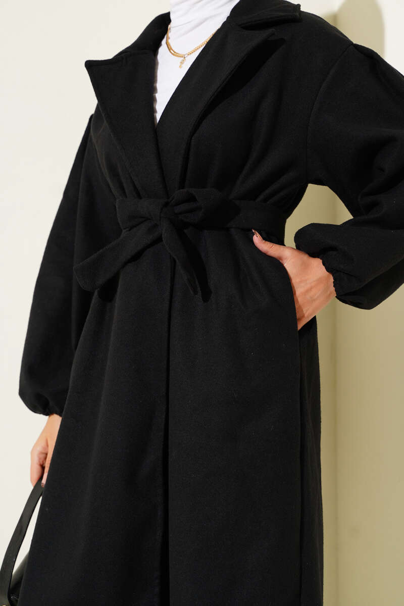 Cepli Kuşaklı Kruvaze Yaka Kaşe Kaban Siyah