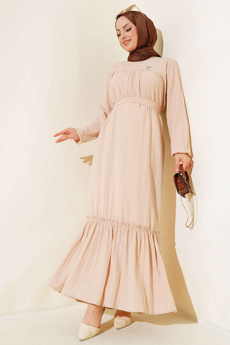 Bilekleri Lastikli Kuşaklı Elbise Bej