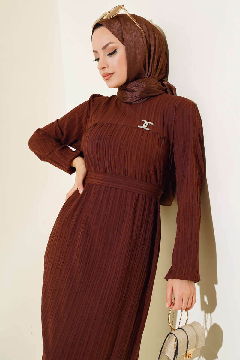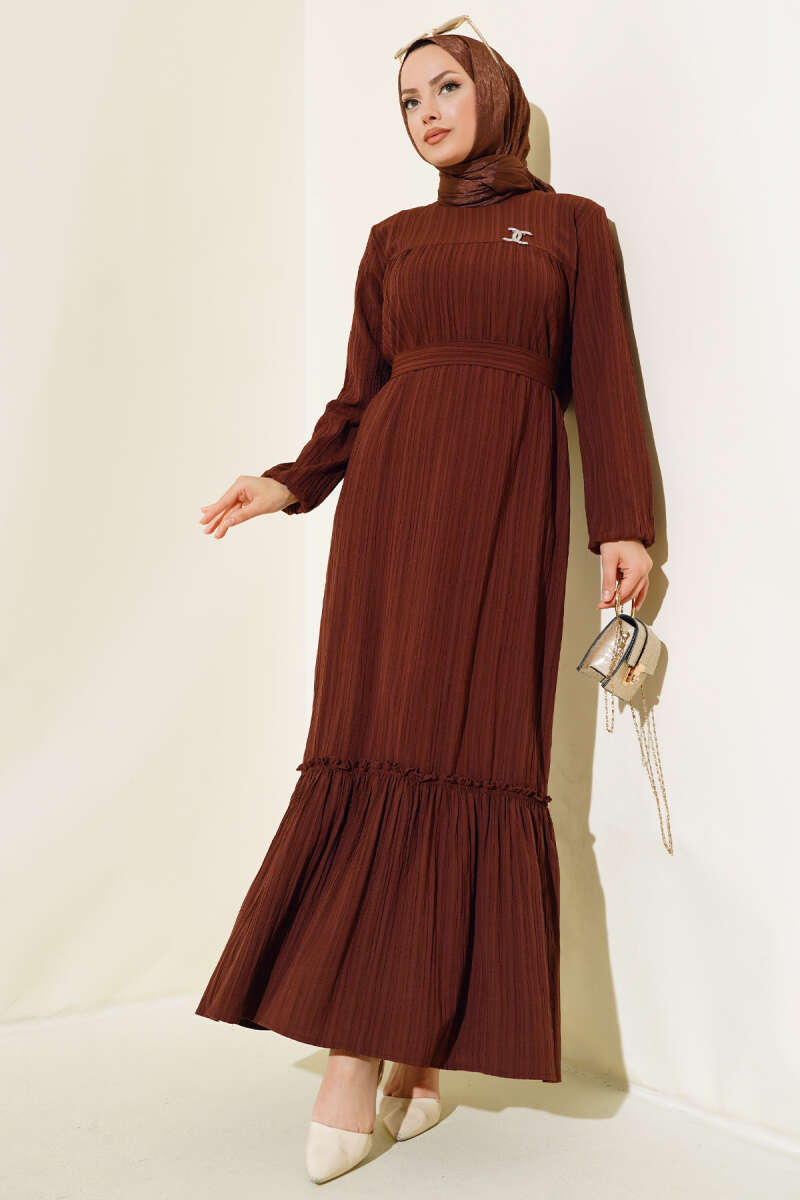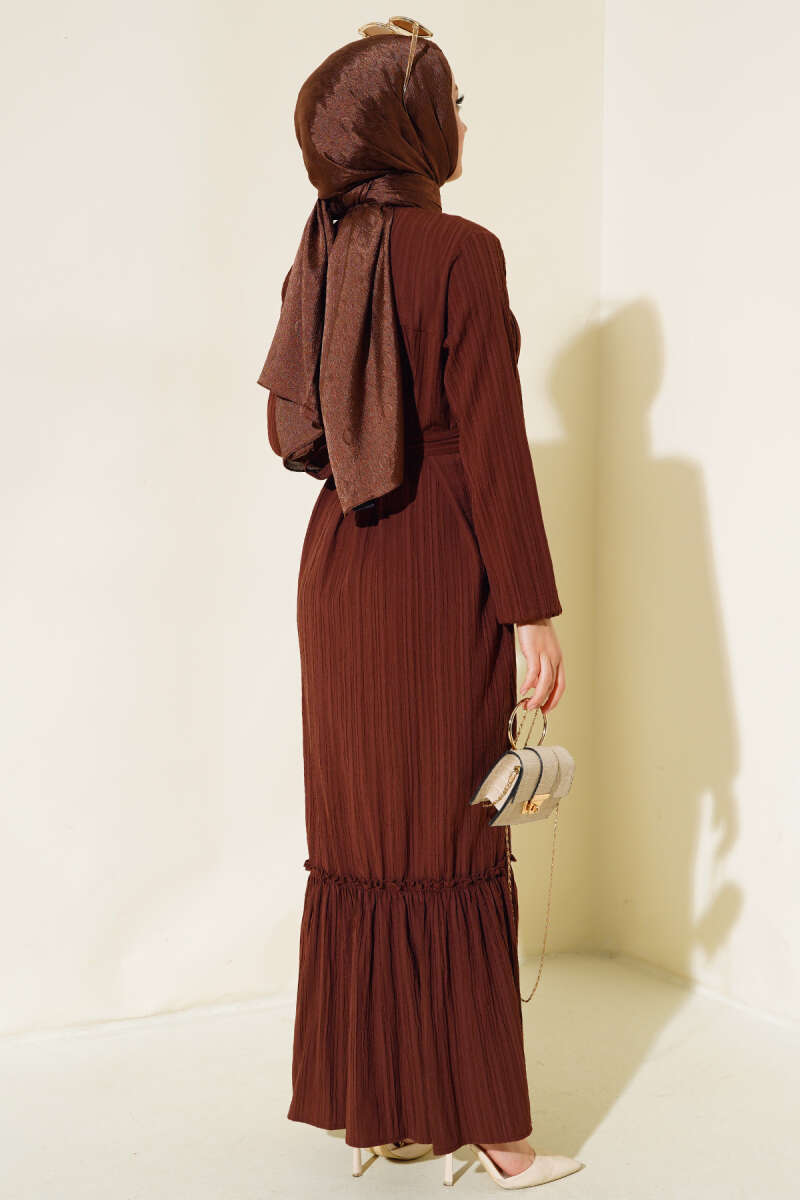 Bilekleri Lastikli Kuşaklı Elbise Kahve