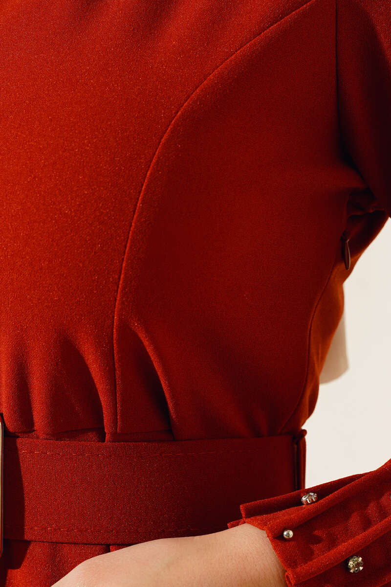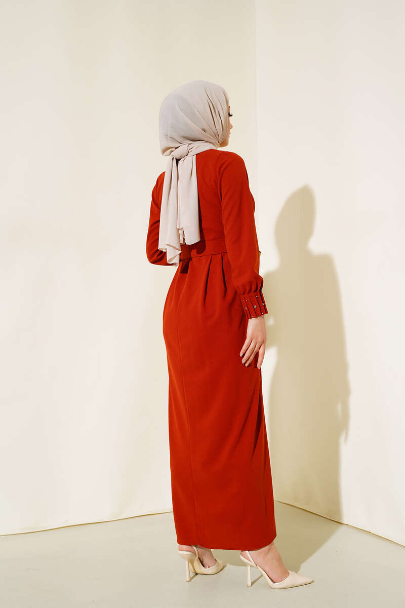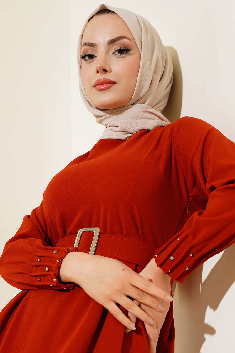 Yeni sezon elbisemiz sizlerle beraber. Elbisemizin kol bilekleri nervüllü ve taş detaylıdır. İki adet kemer köprüsü olup, kemeri vardır. Elbisemizin hem belinde fermuarı olup, hem enseden düğmelidir. Astarsızdır. Renk seçenekleriyle dolabınızda yerini beklemektedir.
