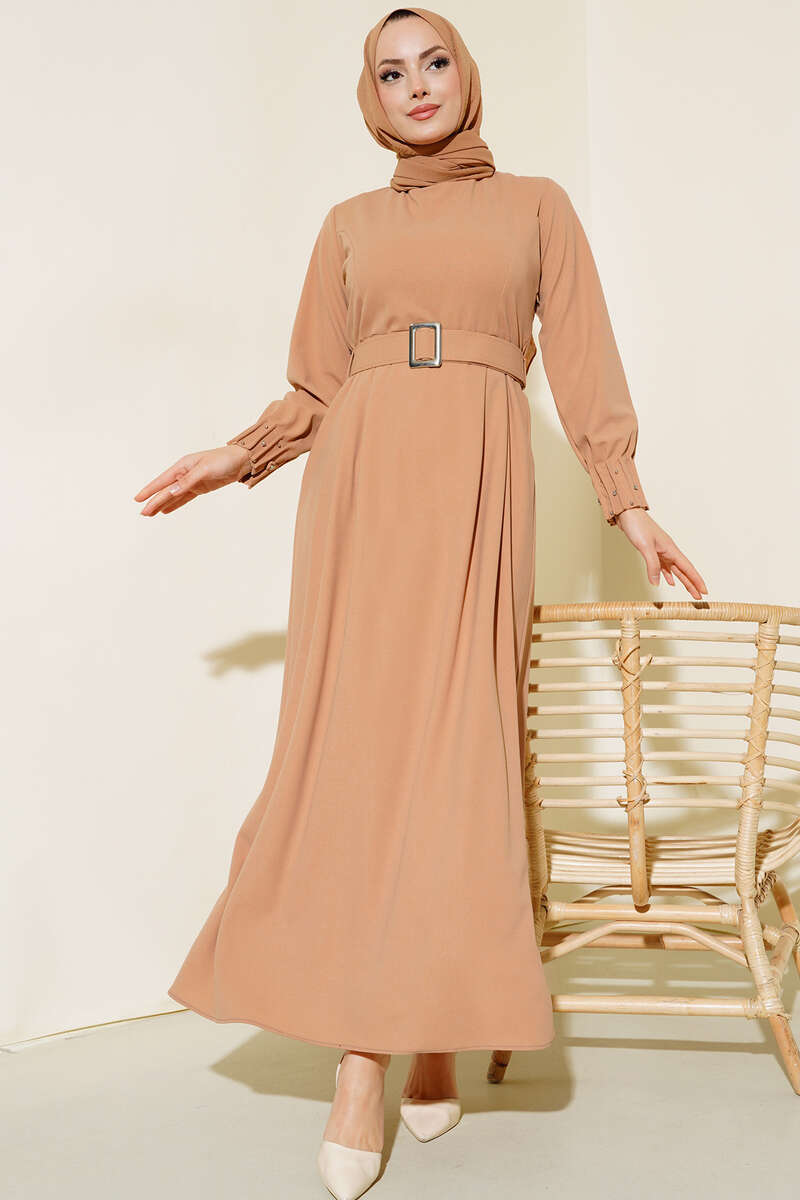 Yeni sezon elbisemiz sizlerle beraber. Elbisemizin kol bilekleri nervüllü ve taş detaylıdır. İki adet kemer köprüsü olup, kemeri vardır. Elbisemizin hem belinde fermuarı olup, hem enseden düğmelidir. Astarsızdır. Renk seçenekleriyle dolabınızda yerini beklemektedir.