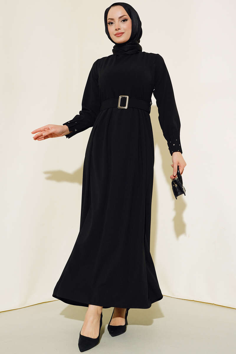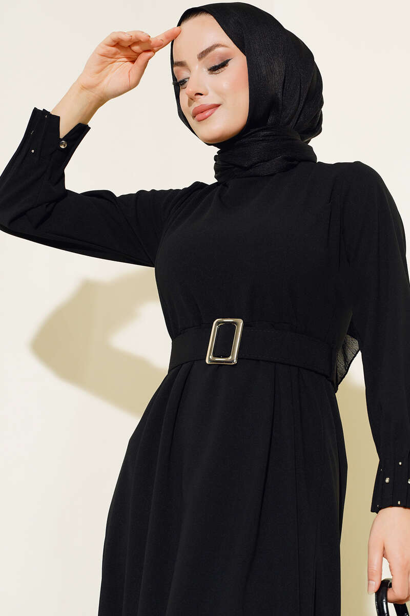 Yeni sezon elbisemiz sizlerle beraber. Elbisemizin kol bilekleri nervüllü ve taş detaylıdır. İki adet kemer köprüsü olup, kemeri vardır. Elbisemizin hem belinde fermuarı olup, hem enseden düğmelidir. Astarsızdır. Renk seçenekleriyle dolabınızda yerini beklemektedir.