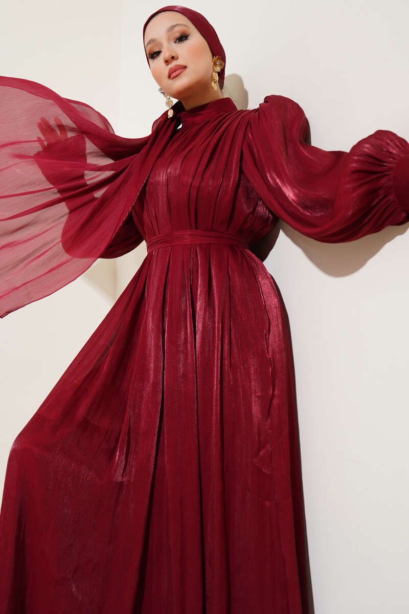 Omuz Pelerinli Taş Detaylı Abiye Elbise Bordo