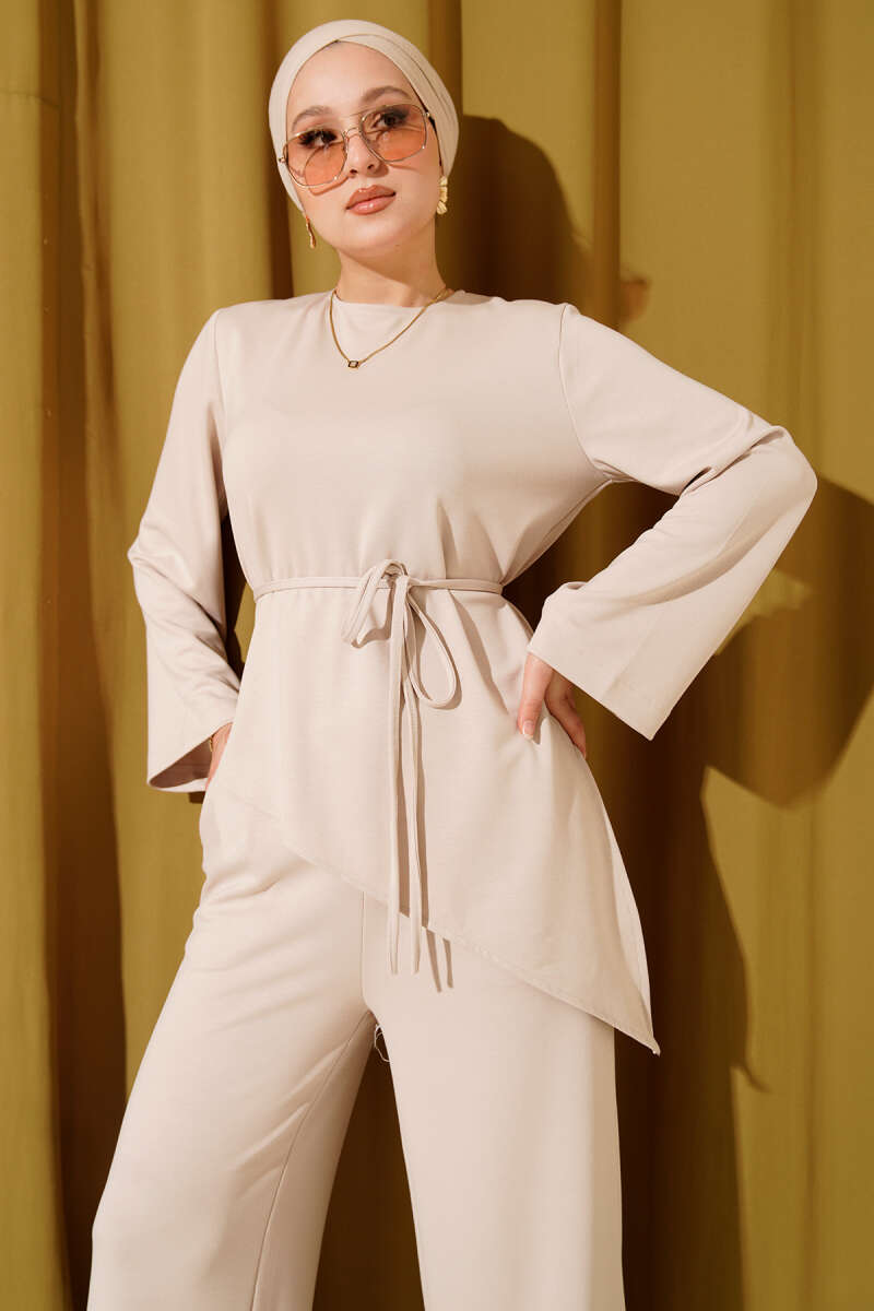 Dar Paça Bel Lastikli Çımalı Pantolon Bej
