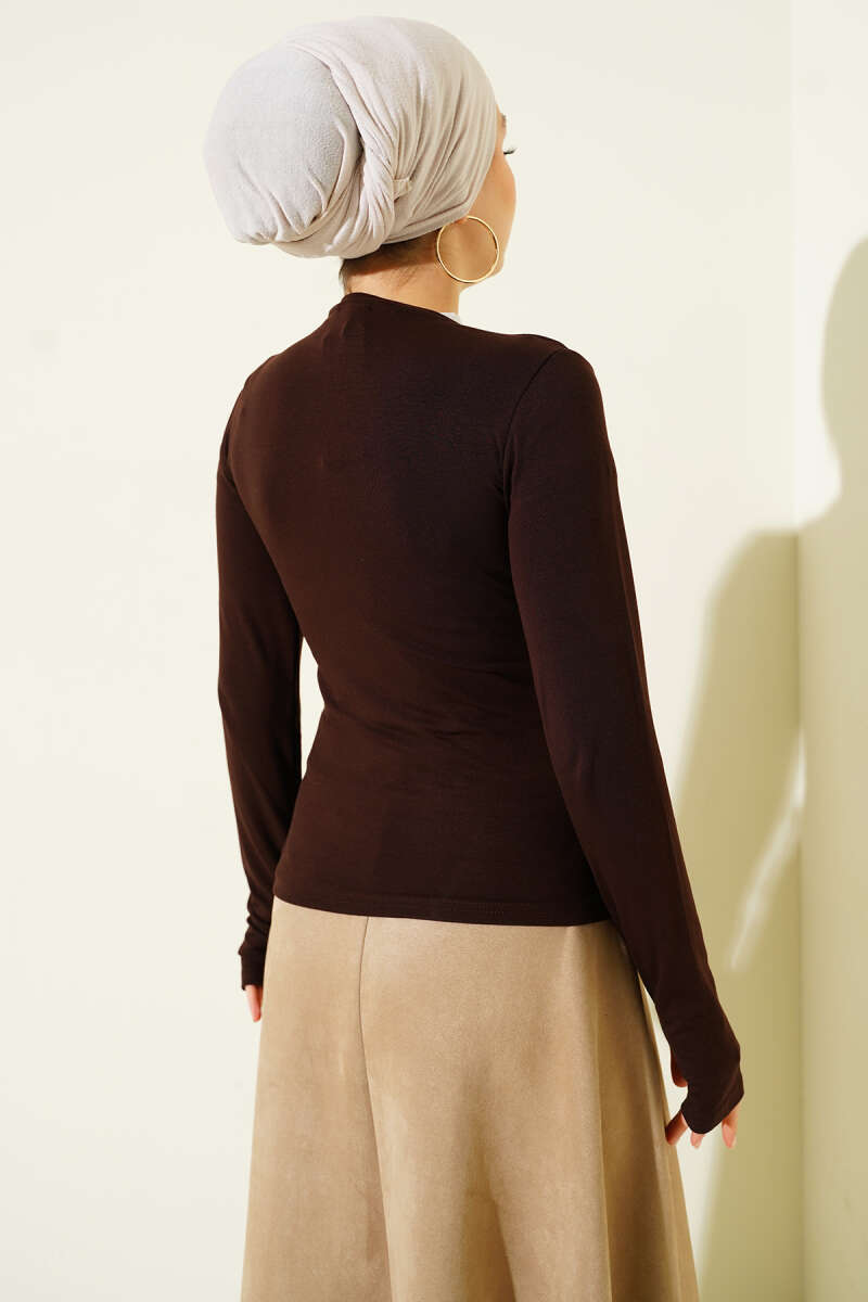 Yan Büzgülü Dik Yaka Sandy Bluz Kahve