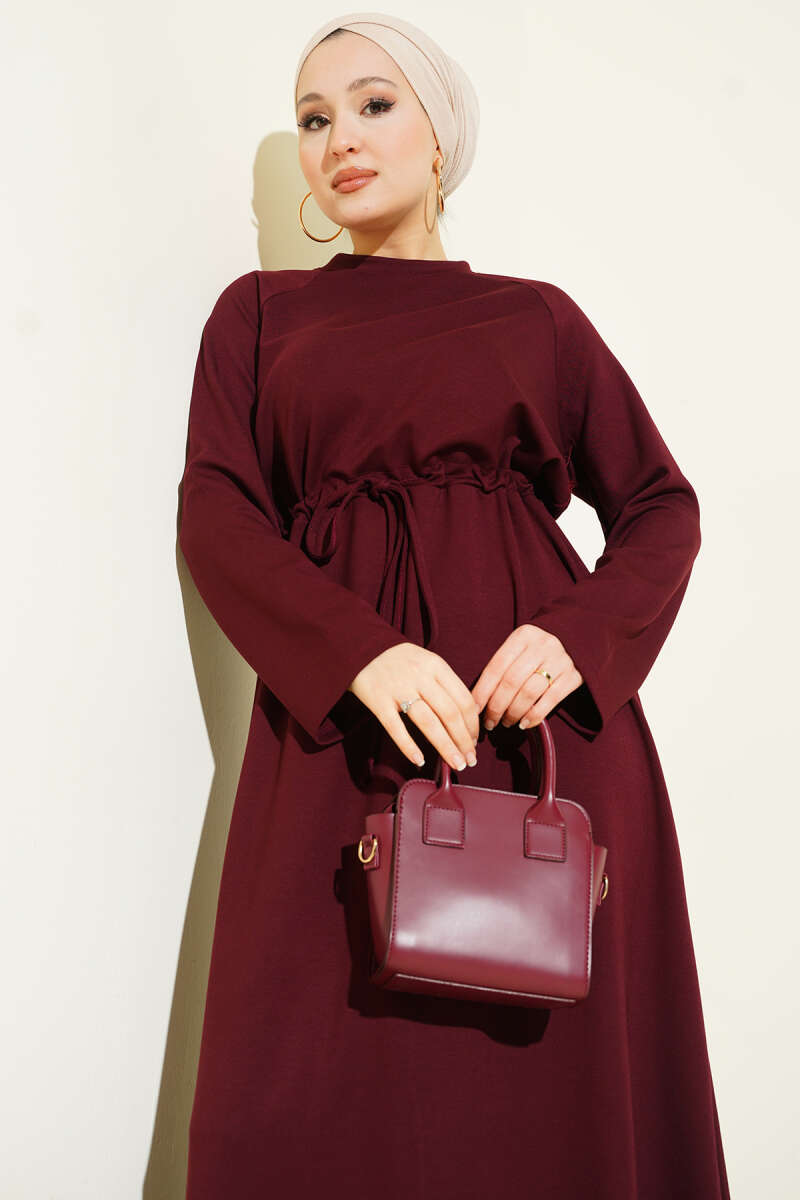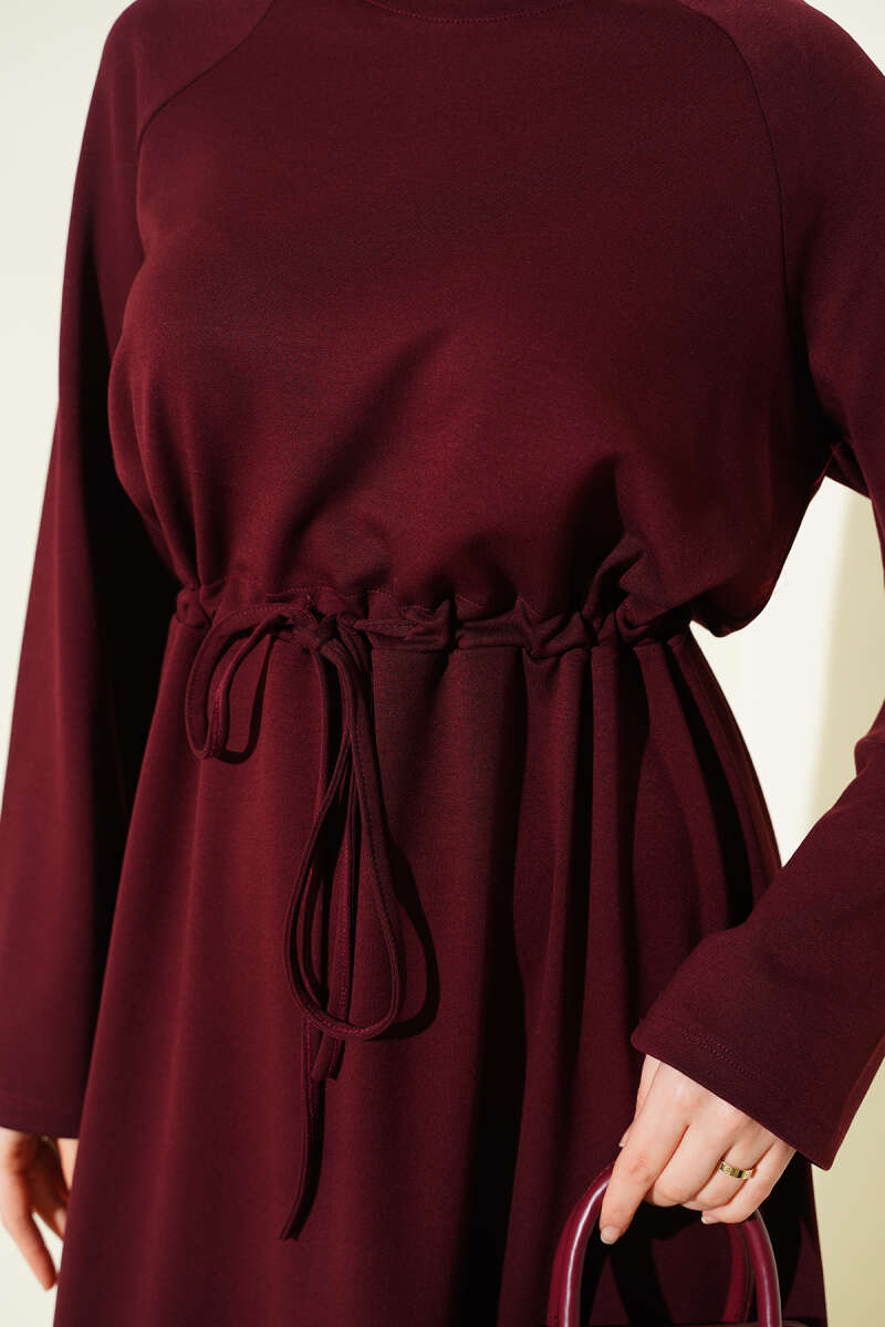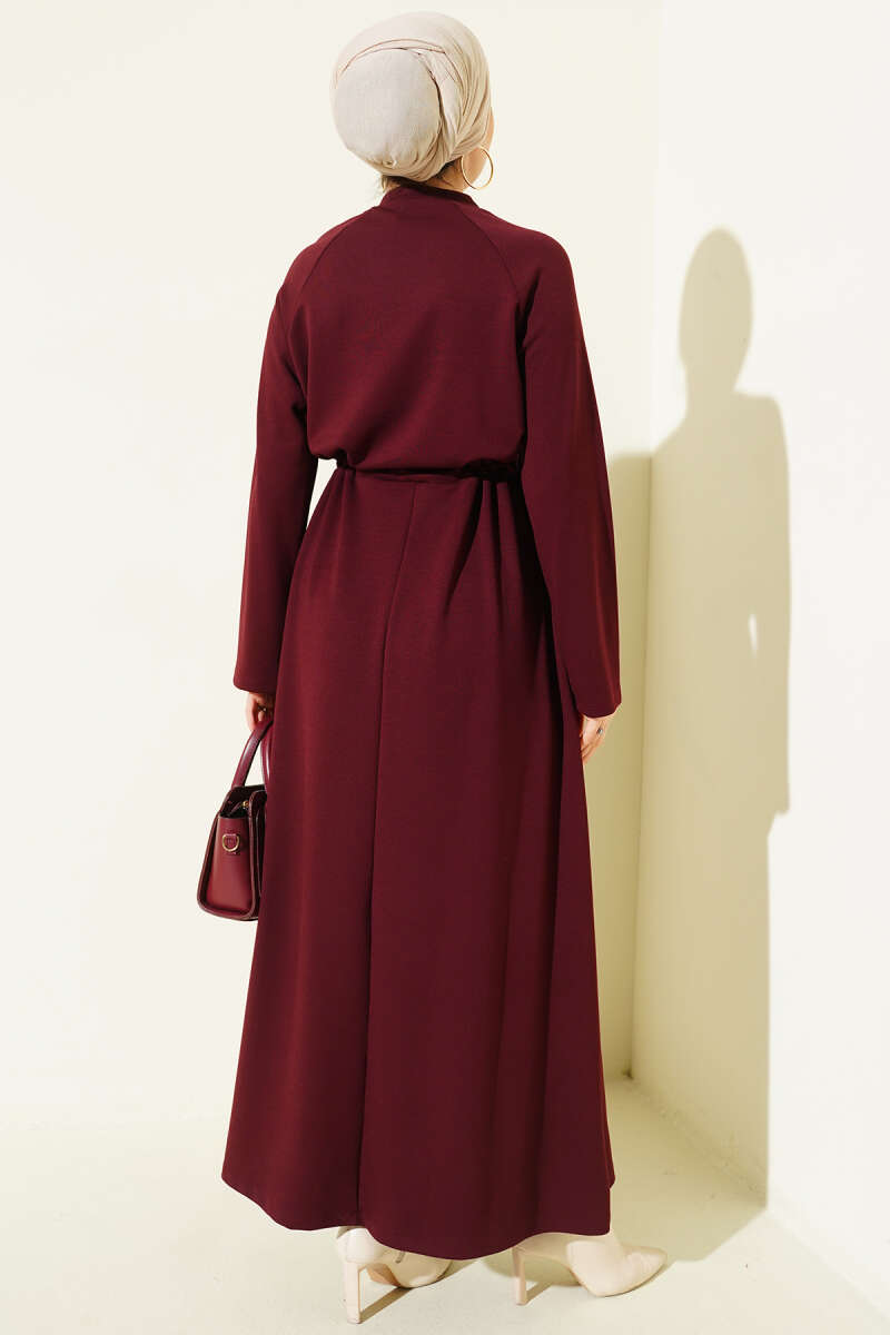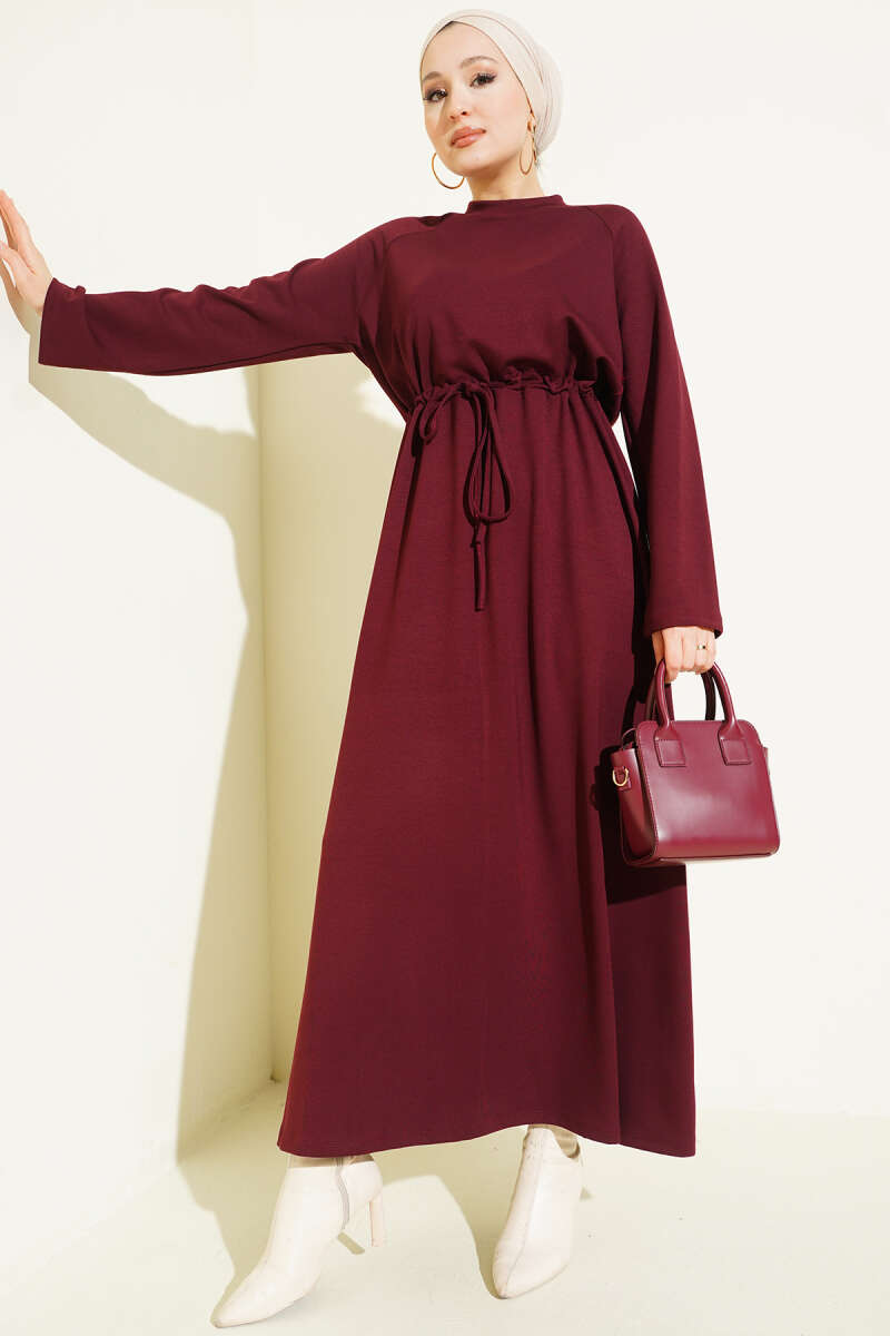 Bisiklet Yaka Fitilli Triko Elbise Bordo