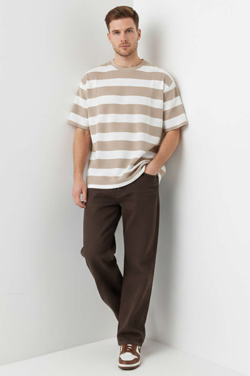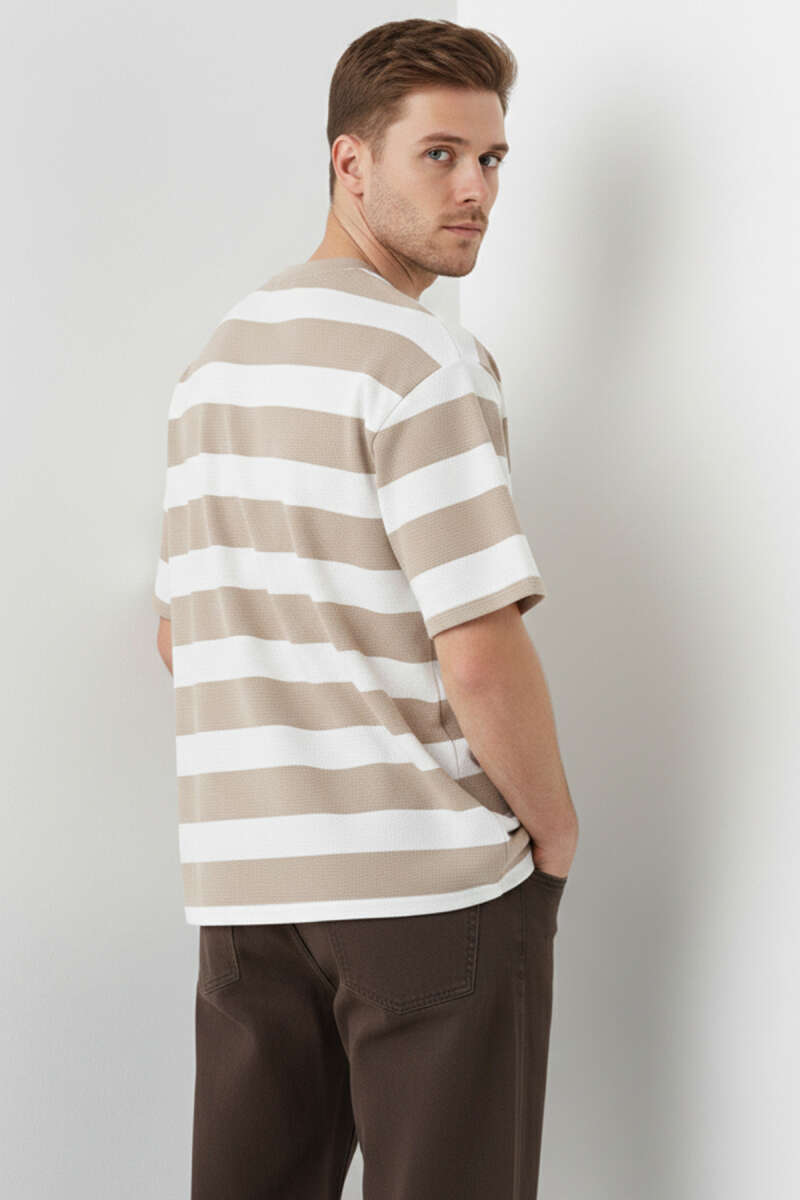 Bisiklet Yaka Blok Renkli T-shirt Bej