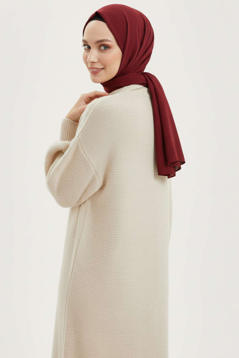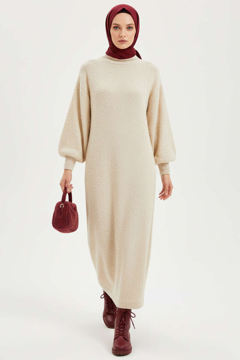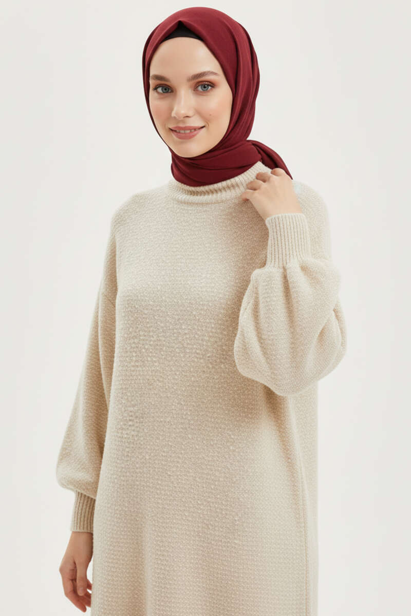 Çizgi Detaylı Balon Kol Triko Elbise Bordo