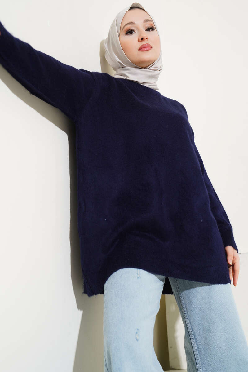 Bisiklet Yaka Düz Triko Tunik Lacivert